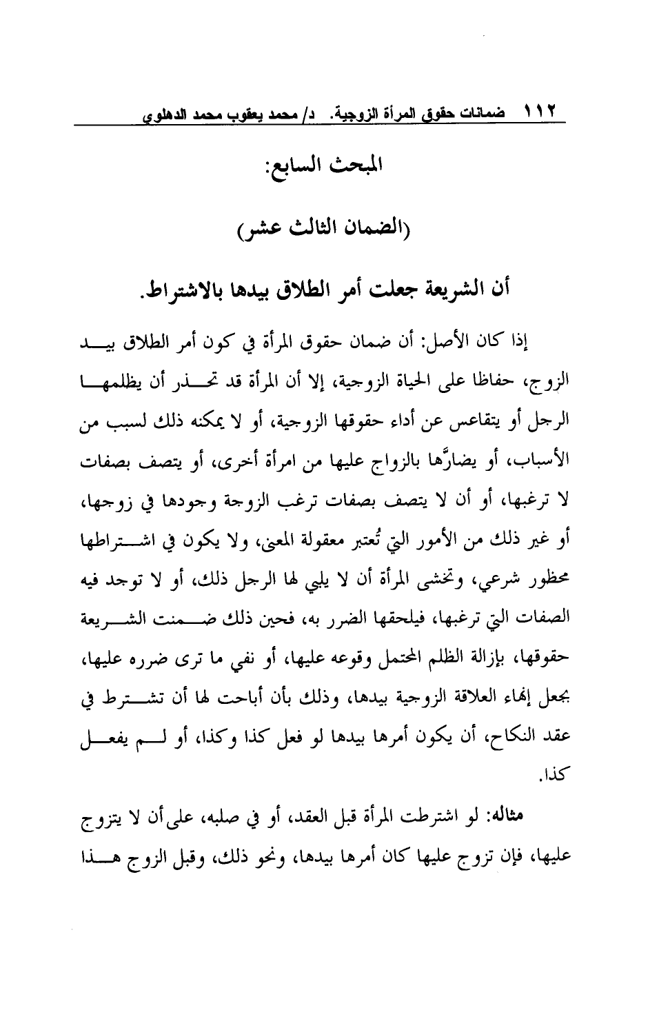 المبحث السابع: (الضمان الثالث عشر) : أن الشريعة جعلت أمر الطلاق بيدها بالاشتراط.