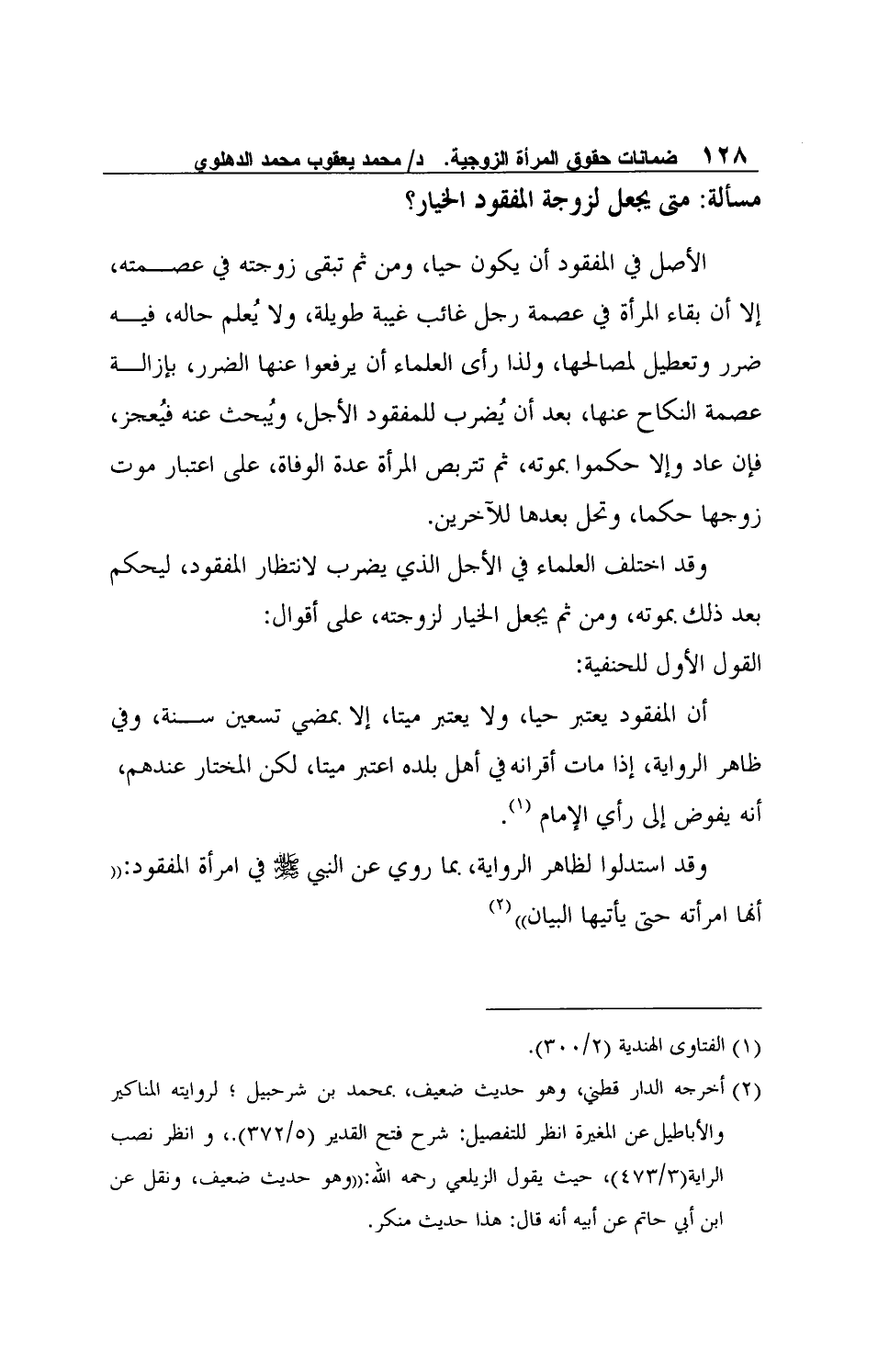 وقد استدلوا لظاهر الرواية، بما روي عن النبي صلى الله عليه وسلم في امرأة المفقود: "أنها امرأته حتى يأتيها البيان"2