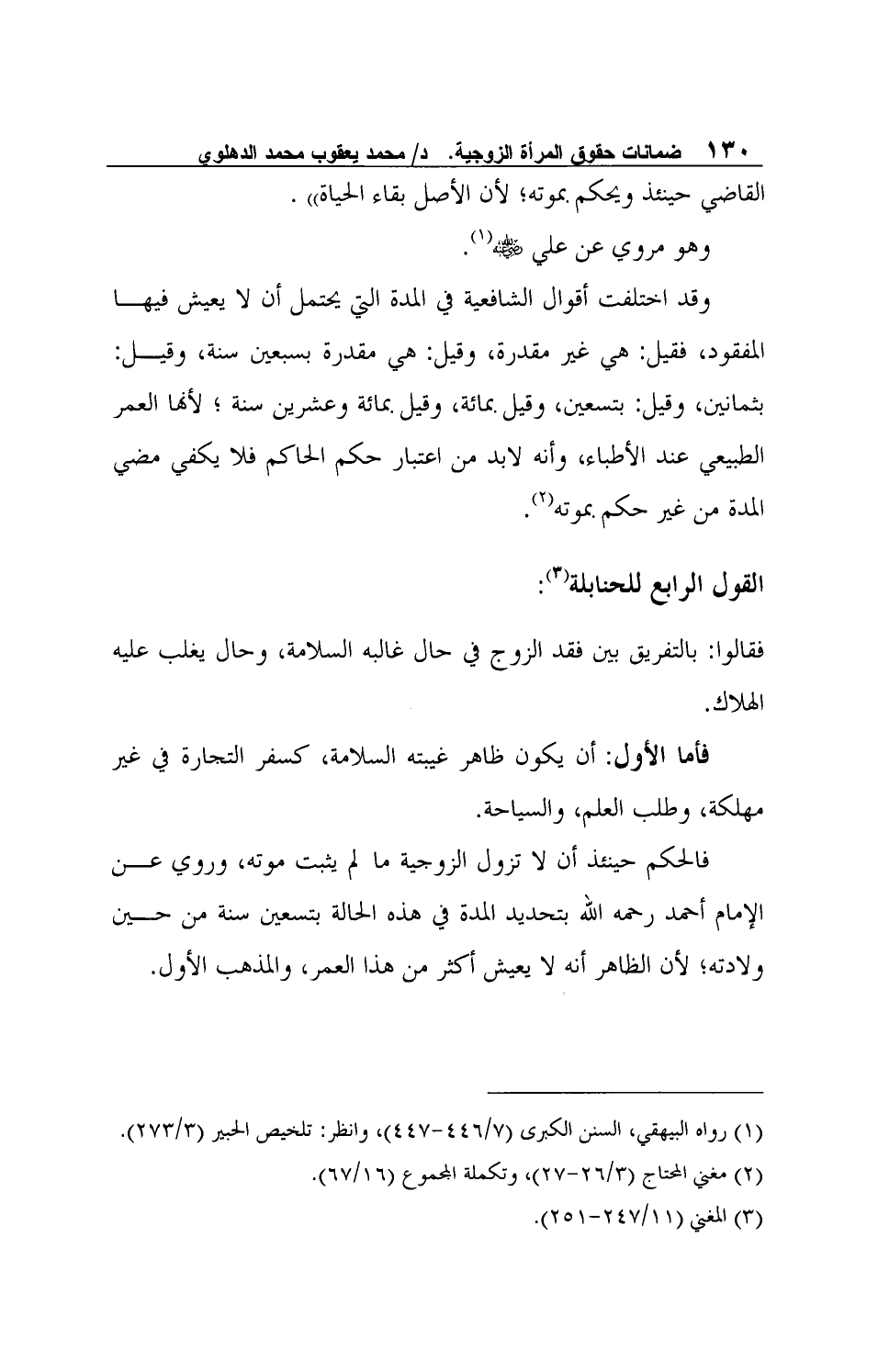 القول الرابع للحنابلة3: فقالوا: بالتفريق بين فقد الزوج في حال غالبه السلامة، وحال يغلب عليه الهلاك.