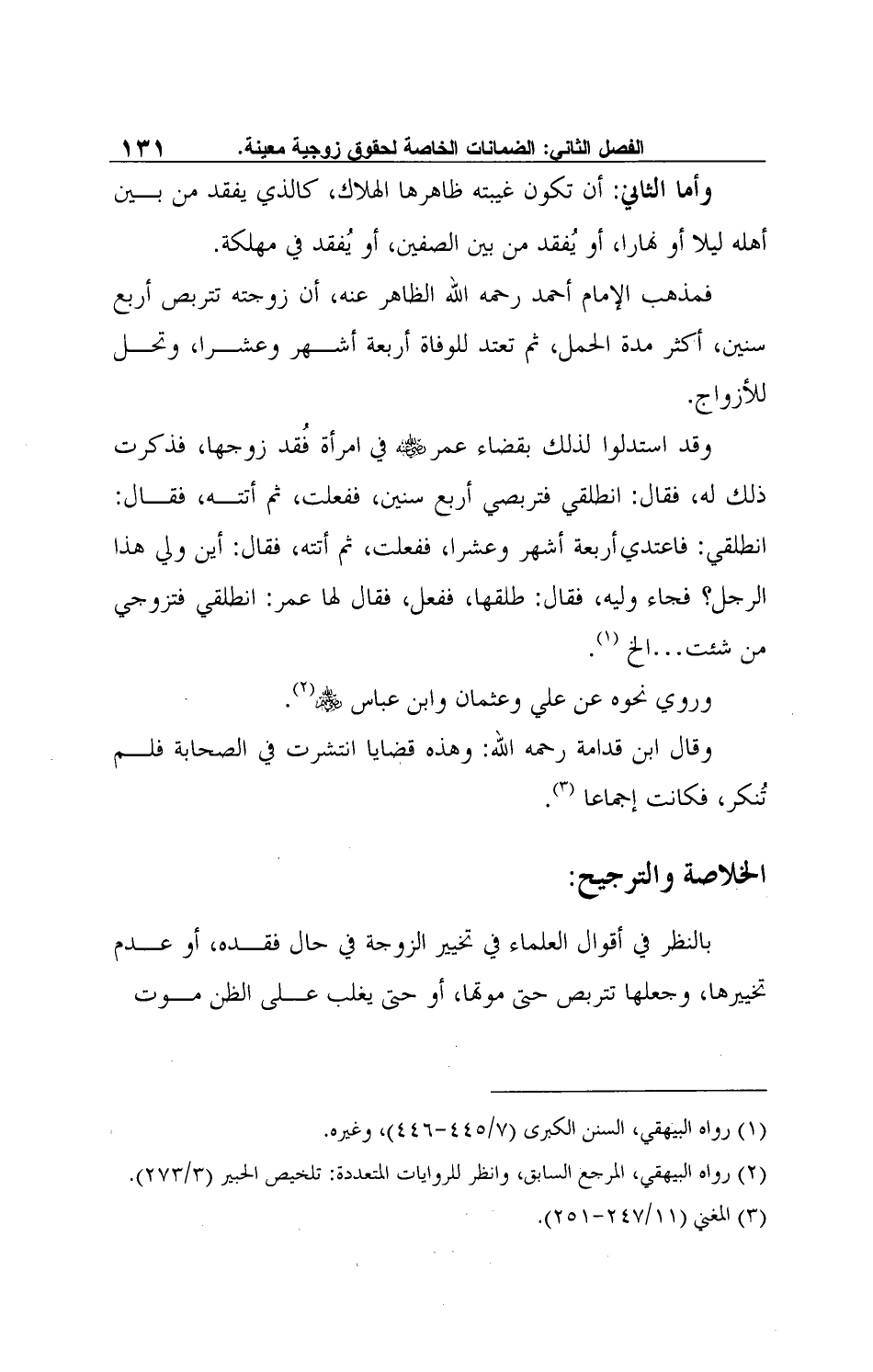 وقد استدلوا لذلك بقضاء عمر رضي الله عنه في امرأة فُقد زوجها، فذكرت ذلك له، فقال: انطلقي فتربصي أربع سنين، ففعلت، ثم أتته، فقال: انطلقي: فاعتدي أربعة أشهر وعشرا، ففعلت، ثم أتته، فقال: أين ولي هذا الرجل؟ فجاء وليه، فقال: طلقها، ففعل، فقال لها عمر: انطلقي فتزوجي من شئت…الخ1.