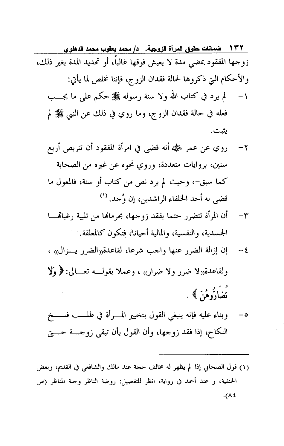 5- وبناء عليه فإنه ينبغي القول بتخيير المرأة في طلب فسخ النكاح، إذا فقد زوجها، وأن القول بأن تبقى زوجة حتى