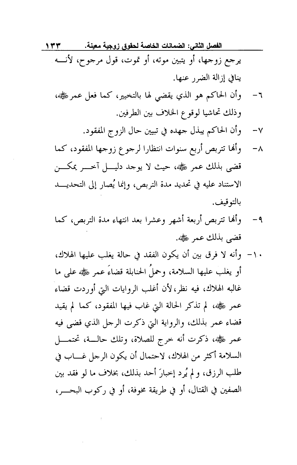 10- وأنه لا فرق بين أن يكون الفقد في حالة يغلب عليها الهلاك، أو يغلب عليها السلامة، وحملُ الحنابلة قضاءَ عمر رضي الله عنه على ما غالبه الهلاك، فيه نظر، لأن أغلب الروايات التي أوردت قضاء عمر رضي الله عنه، لم تذكر الحالة التي غاب فيها المفقود، كما لم يقيد قضاء عمر بذلك، والرواية التي ذكرت الرجل الذي قضى فيه عمر رضي الله عنه، ذكرت أنه خرج للصلاة، وتلك حالة، تحتمل السلامة أكثر من الهلاك، لاحتمال أن يكون الرجل غاب في طلب الرزق، ولم يُرد إخبارَ أحد بذلك، بخلاف ما لو فقد بين الصفين في القتال، أو في طريقة مخوفة، أو في ركوب البحر،