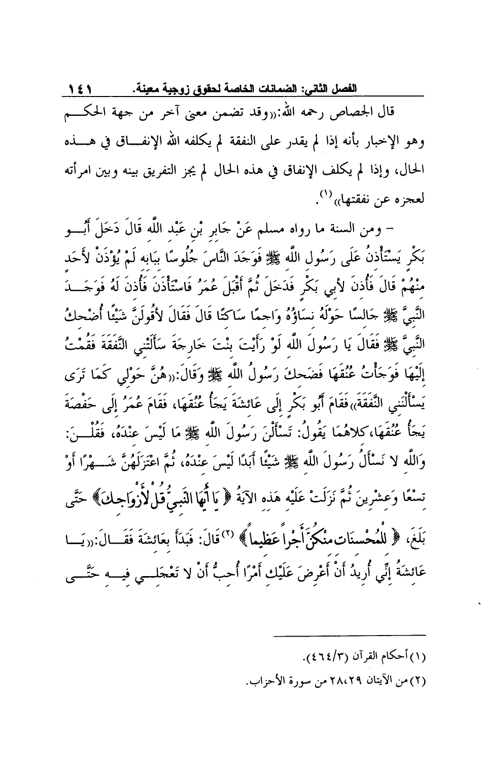- ومن السنة ما رواه مسلم عَنْ جَابِرِ بْنِ عَبْدِ اللَّهِ قَا لَ دَخَلَ أَبُو بَكْرٍ يَسْتَأْذِنُ عَلَى رَسُولِ اللَّهِ صلى الله عليه وسلم فَوَجَدَ النَّاسَ جُلُوسًا بِبَابِهِ لَمْ يُؤْذَنْ لأَحَدٍ مِنْهُمْ قَالَ فَأُذِنَ لأبِي بَكْرٍ فَدَخَلَ ثُمَّ أَقْبَلَ عُمَرُ فَاسْتَأْذَنَ فَأُذِنَ لَهُ فَوَجَدَ النَّبِيَّ صلى الله عليه وسلم جَالِسًا حَوْلَهُ نِسَاؤُهُ وَاجِمًا سَاكِتًا قَالَ فَقَالَ لأقُولَنَّ شَيْئًا أُضْحِكُ النَّبِيَّ صلى الله عليه وسلم فَقَالَ يَا رَسُولَ اللَّهِ لَوْ رَأَيْتَ بِنْتَ خَارِجَةَ سَأَلَتْنِي النَّفَقَةَ فَقُمْتُ إِلَيْهَا فَوَجَأْتُ عُنُقَهَا فَضَحِكَ رَسُولُ اللَّهِ صلى الله عليه وسلم وَقَالَ: "هُنَّ حَوْلِي كَمَا تَرَى يَسْأَلْنَنِي النَّفَقَةَ" فَقَامَ أَبُو بَكْرٍ إِلَى عَائِشَةَ يَجَأُ عُنُقَهَا، فَقَامَ عُمَرُ إِلَى حَفْصَةَ يَجَأُ عُنُقَهَا، كِلاهُمَا يَقُولُ: تَسْأَلْنَ رَسُولَ اللَّهِ صلى الله عليه وسلم مَا لَيْسَ عِنْدَهُ، فَقُلْنَ: وَاللَّهِ لا نَسْأَلُ رَسُولَ اللَّهِ صلى الله عليه وسلم شَيْئًا أَبَدًا لَيْسَ عِنْدَهُ، ثُمَّ اعْتَزَلَهُنَّ شَهْرًا أَوْ تِسْعًا وَعِشْرِينَ ثُمَّ نَزَلَتْ عَلَيْهِ هَذِهِ الآيَةُ {يَا أَيُّهَا النَّبِيُّ قُلْ لأَزْوَاجِكَ} حَتَّى بَلَغَ، {لِلْمُحْسِنَاتِ مِنْكُنَّ أَجْراً عَظِيماً} 2 قَالَ: فَبَدَأَ بِعَائِشَةَ فَقَالَ: "يَا عَائِشَةُ إِنِّي أُرِيدُ أَنْ أَعْرِضَ عَلَيْكِ أَمْرًا أُحِبُّ أَنْ لا تَعْجَلِي فِيهِ حَتَّى