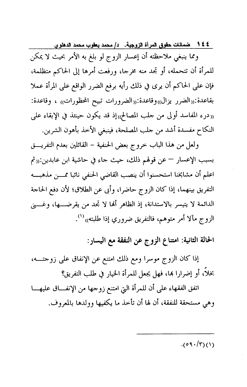 ومما ينبغي ملاحظته أن إعسار الزوج لو بلغ به الأمر بحيث لا يمكن للمرأة أن تتحمله، أو تجد منه مخرجا، ورفعت أمرها إلى الحاكم متظلمة، فإن على الحاكم أن يرى في ذلك رأيه برفع الضرر الواقع على المرأة عملا بقاعدة: "الضرر يزال" وقاعدة: "الضرورات تبيح المحظورات"، وقاعدة: "درء المفاسد أولى من جلب المصالح" إذ قد يكون حينئذ في الإبقاء على النكاح مفسدة أشد من جلب المصلحة، فينبغي الأخذ بأهون الشرين.