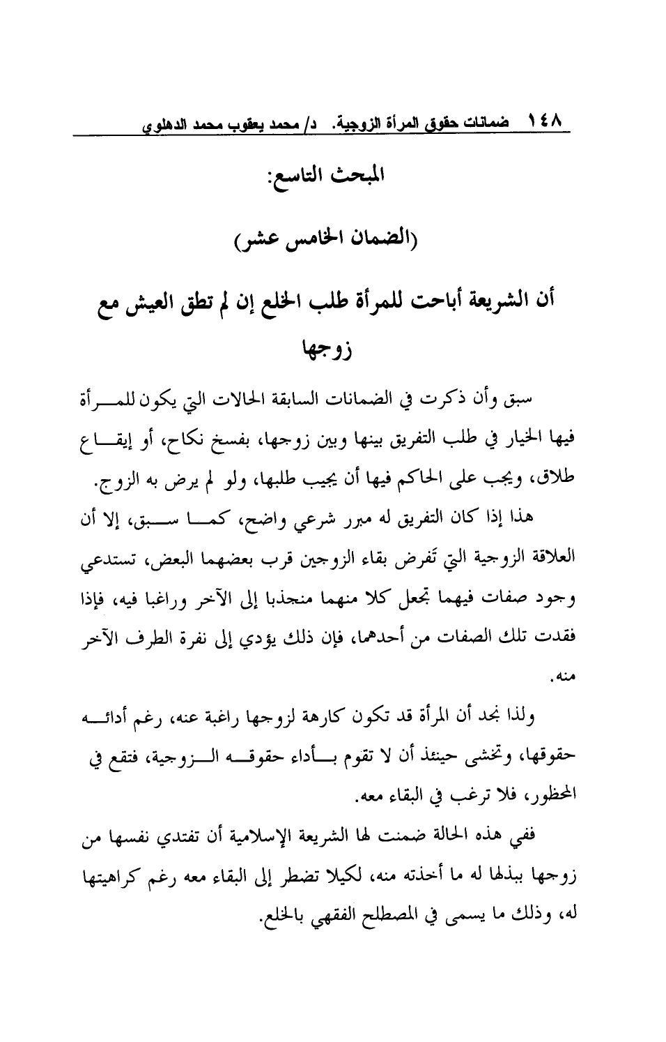 المبحث التاسع: (الضمان الخامس عشر) : أن الشريعة أباحت للمرأة طلب الخلع إن لم تطق العيش مع زوجها