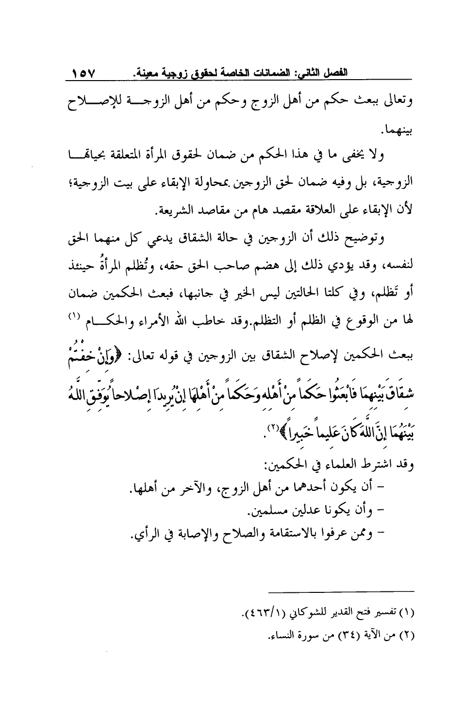 وتوضيح ذلك أن الزوجين في حالة الشقاق يدعي كل منهما الحق لنفسه، وقد يؤدي ذلك إلى هضم صاحب الحق حقه، وتُظلم المرأةُ حينئذ أو تَظلم، وفي كلتا الحالتين ليس الخير في جانبها، فبعث الحكمين ضمان لها من الوقوع في الظلم أو التظلم. وقد خاطب الله الأمراء والحكام1 ببعث الحكمين لإصلاح الشقاق بين الزوجين في قوله تعالى: {وَإِنْ خِفْتُمْ شِقَاقَ بَيْنِهِمَا فَابْعَثُوا حَكَماً مِنْ أَهْلِهِ وَحَكَماً مِنْ أَهْلِهَا إِنْ يُرِيدَا إِصْلاحاً يُوَفِّقِ اللَّهُ بَيْنَهُمَا إِنَّ اللَّهَ كَانَ عَلِيماً خَبِيراً} 2.