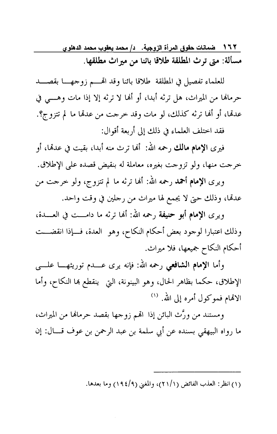 وأما الإمام الشافعي رحمه الله: فإنه يرى عدم توريثها على الإطلاق، حكما بظاهر الحال، وهو البينونة، التي ينقطع بها النكاح، وأما الاتهام فموكول أمره إلى الله.1