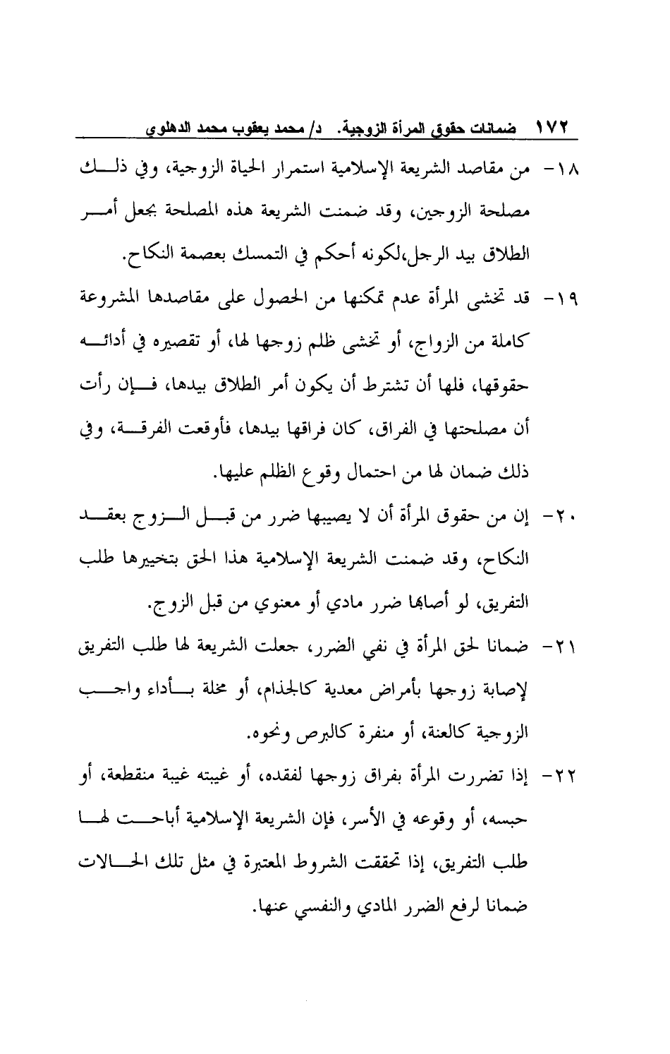 21- ضمانا لحق المرأة في نفي الضرر، جعلت الشريعة لها طلب التفريق لإصابة زوجها بأمراض معدية كالجذام، أو مخلة بأداء واجب الزوجية كالعنة، أو منفرة كالبرص ونحوه.