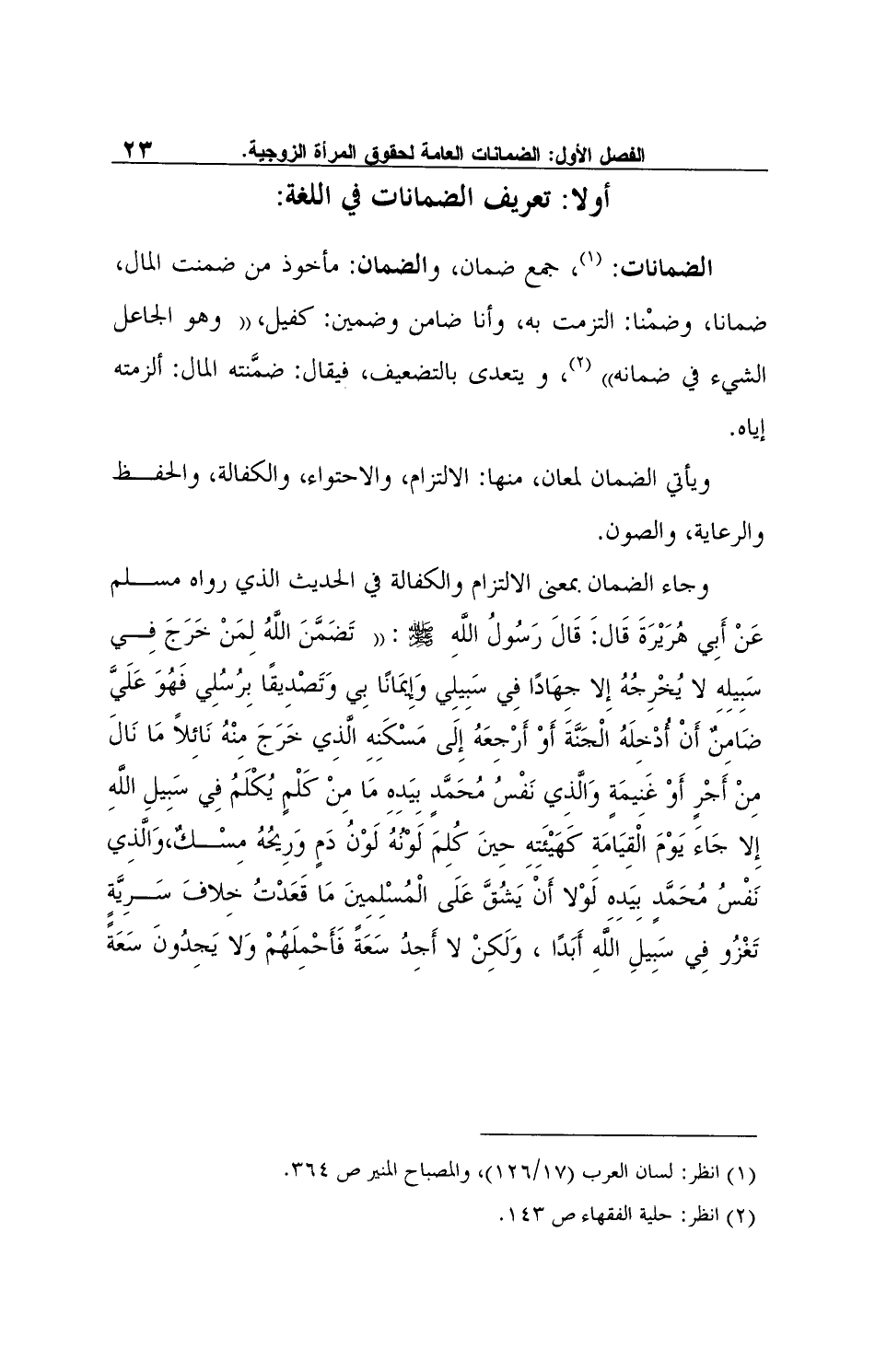 وجاء الضمان بمعنى الالتزام والكفالة في الحديث الذي رواه مسلم عَنْ أَبِي هُرَيْرَةَ قَال: َ قَالَ رَسُولُ اللَّهِ صلى الله عليه وسلم: "تَضَمَّنَ اللَّهُ لِمَنْ خَرَجَ فِي سَبِيلِهِ لا يُخْرِجُهُ إِلا جِهَادًا فِي سَبِيلِي وَإِيمَانًا بِي وَتَصْدِيقًا بِرُسُلِي فَهُوَ عَلَيَّ ضَامِنٌ أَنْ أُدْخِلَهُ الْجَنَّةَ أَوْ أَرْجِعَهُ إِلَى مَسْكَنِهِ الَّذِي خَرَجَ مِنْهُ نَائِلاً مَا نَالَ مِنْ أَجْرٍ أَوْ غَنِيمَةٍ وَالَّذِي نَفْسُ مُحَمَّدٍ بِيَدِهِ مَا مِنْ كَلْمٍ يُكْلَمُ فِي سَبِيلِ اللَّهِ إِلا جَاءَ يَوْمَ الْقِيَامَةِ كَهَيْئَتِهِ حِينَ كُلِمَ لَوْنُهُ لَوْنُ دَمٍ وَرِيحُهُ مِسْكٌ، وَالَّذِي نَفْسُ مُحَمَّدٍ بِيَدِهِ لَوْلا أَنْ يَشُقَّ عَلَى الْمُسْلِمِينَ مَا قَعَدْتُ خِلافَ سَرِيَّةٍ تَغْزُو فِي سَبِيلِ اللَّهِ أَبَدًا، وَلَكِنْ لا أَجِدُ سَعَةً فَأَحْمِلَهُمْ وَلا يَجِدُونَ سَعَةً