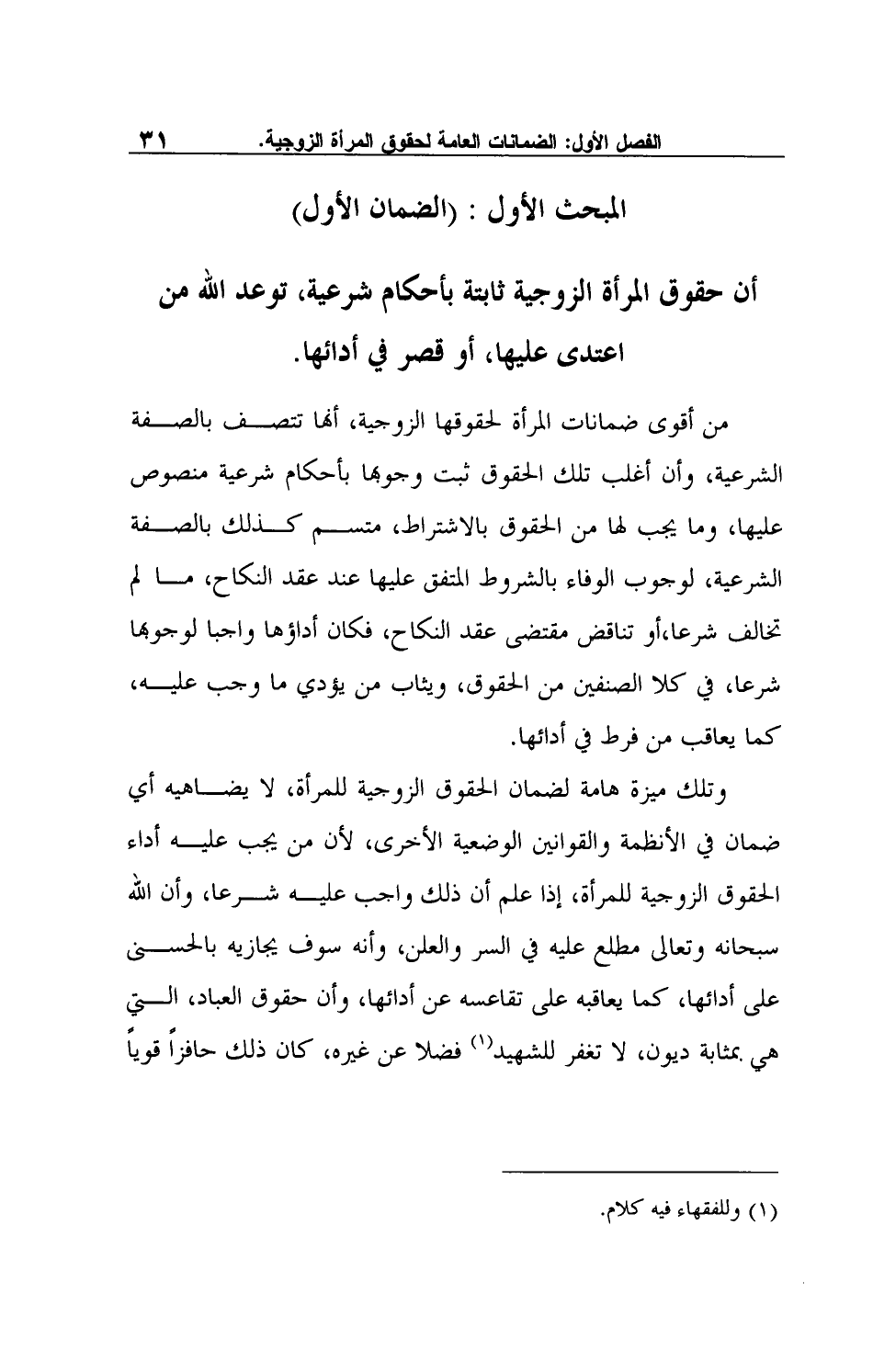 المبحث الأول: (الضمان الأول) : أن حقوق المرأة الزوجية ثابتة بأحكام شرعية، توعد الله من اعتدى عليها، أو قصر في أدائها.