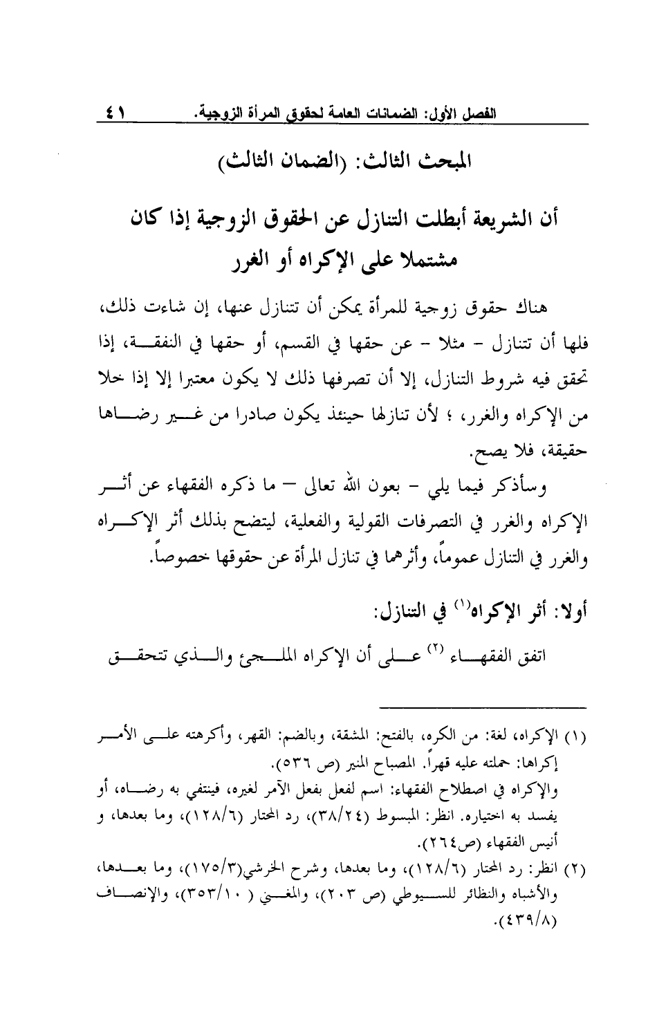 المبحث الثالث: (الضمان الثالث) : أن الشريعة أبطلت التنازل عن الحقوق الزوجية إذا كان مشتملا على الإكراه أو الغرر