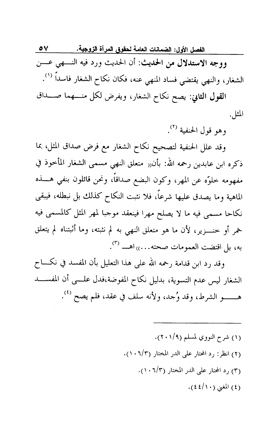 وقد رد ابن قدامة رحمه الله على هذا التعليل بأن المفسد في نكاح الشغار ليس عدم التسوية، بدليل نكاح المفوضة، فدل على أن المفسد هو الشرط، وقد وُجد، ولأنه سلف في عقد، فلم يصح4.