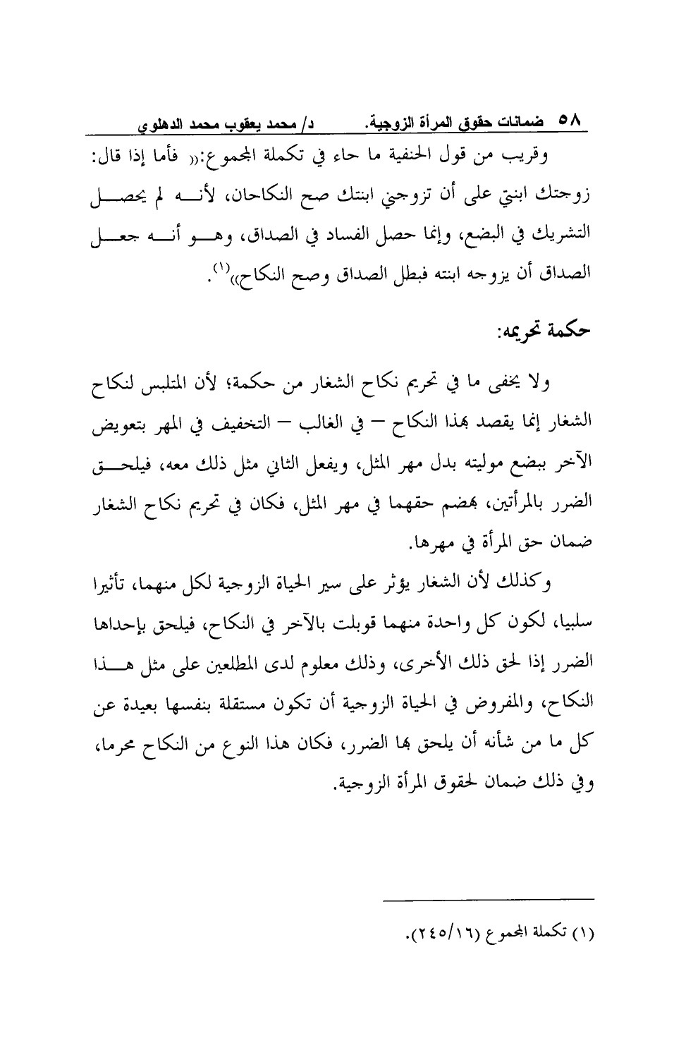وكذلك لأن الشغار يؤثر على سير الحياة الزوجية لكل منهما، تأثيرا سلبيا، لكون كل واحدة منهما قوبلت بالآخر في النكاح، فيلحق بإحداها الضرر إذا لحق ذلك الأخرى، وذلك معلوم لدى المطلعين على مثل هذا النكاح، والمفروض في الحياة الزوجية أن تكون مستقلة بنفسها بعيدة عن كل ما من شأنه أن يلحق بها الضرر، فكان هذا النوع من النكاح محرما، وفي ذلك ضمان لحقوق المرأة الزوجية.