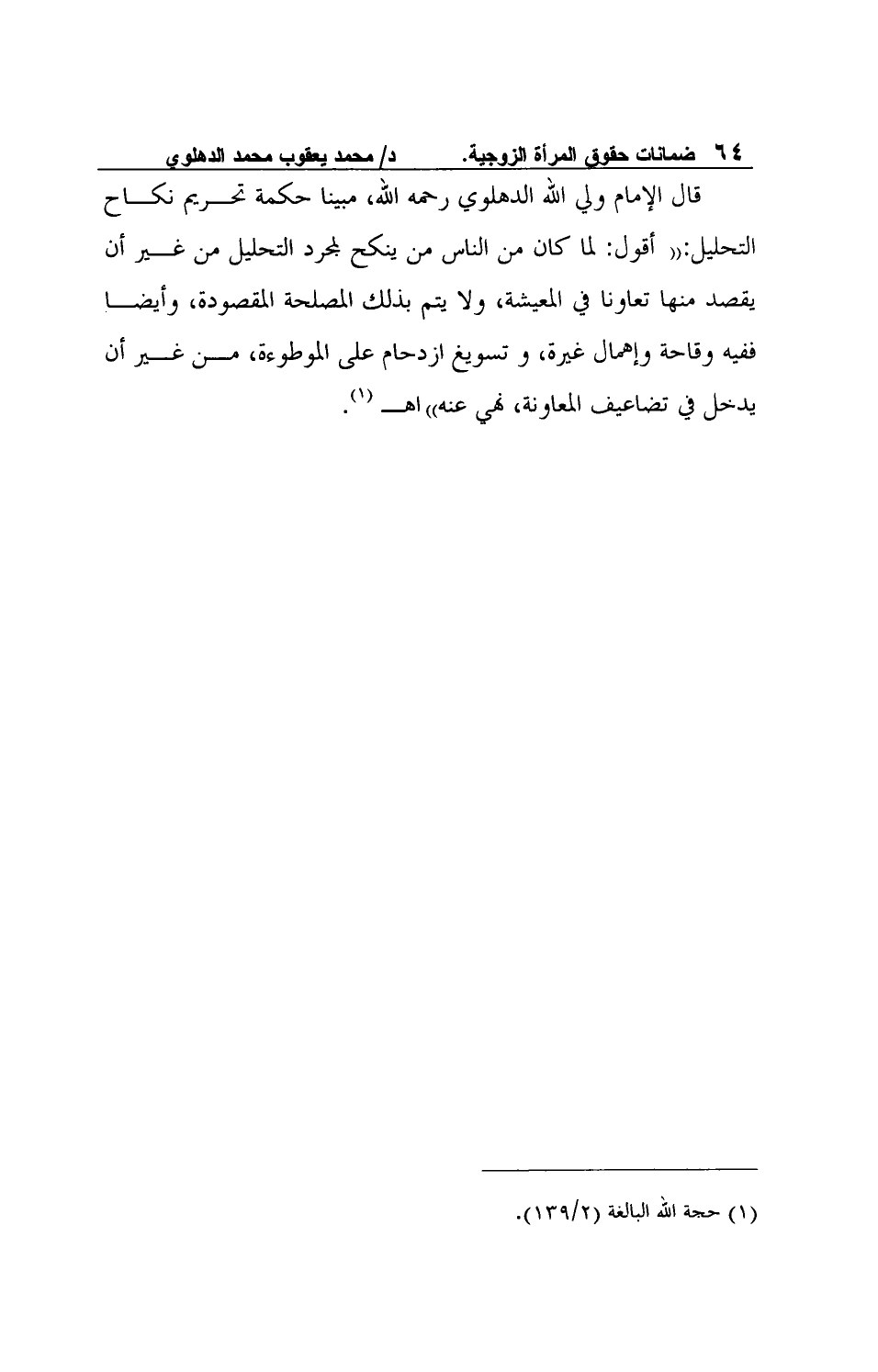 قال الإمام ولي الله الدهلوي رحمه الله، مبينا حكمة تحريم نكاح التحليل: "أقول: لما كان من الناس من ينكح لمجرد التحليل من غير أن يقصد منها تعاونا في المعيشة، ولا يتم بذلك المصلحة المقصودة، وأيضا ففيه وقاحة وإهمال غيرة، وتسويغ ازدحام على الموطوءة، من غير أن يدخل في تضاعيف المعاونة، نهي عنه" اهـ1.