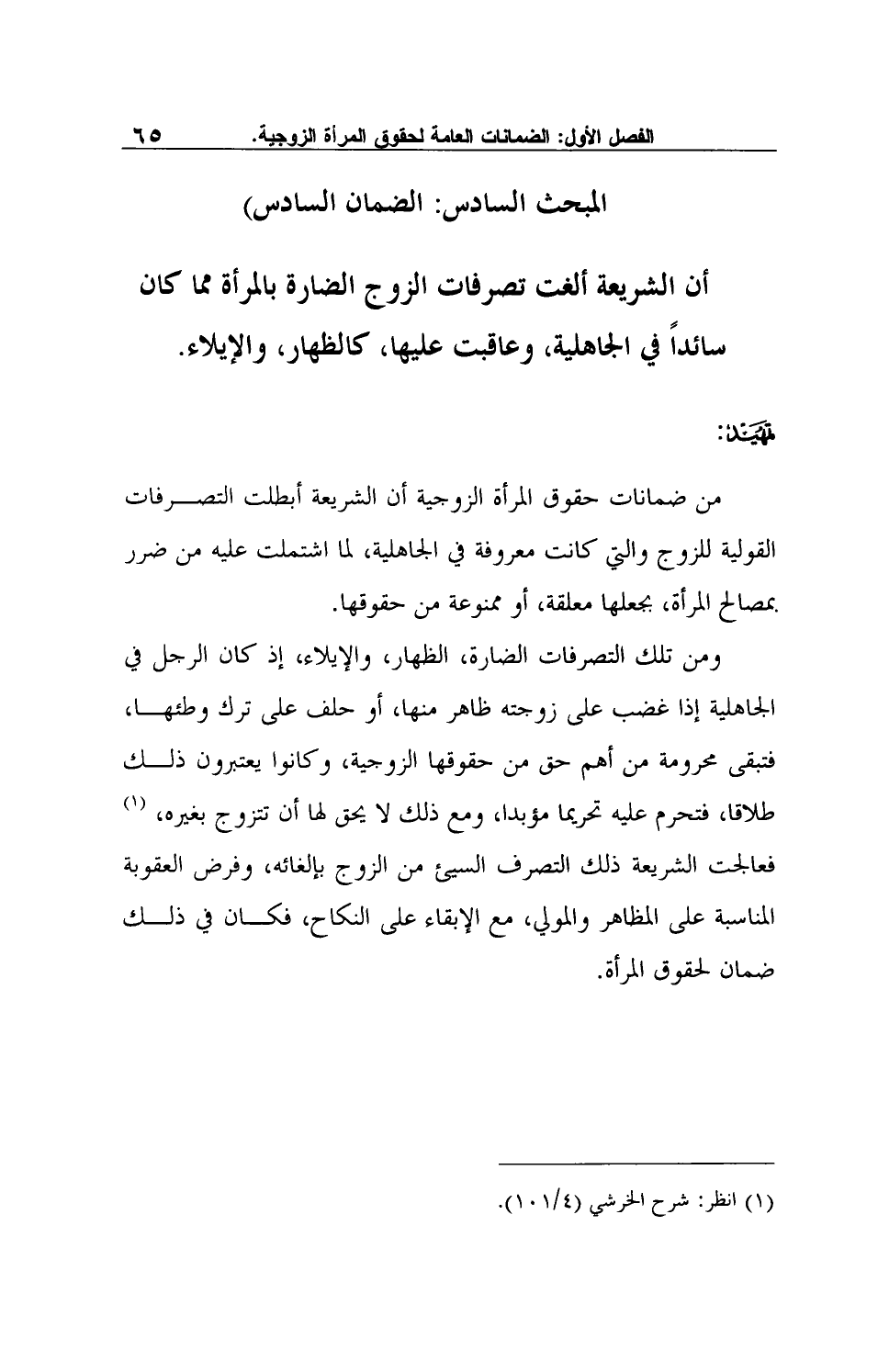المبحث السادس: الضمان السادس) : أن الشريعة ألغت تصرفات الزوج الضارة بالمرأة مما كان سائداً في الجاهلية، وعاقبت عليها، كالظهار، والإيلاء.