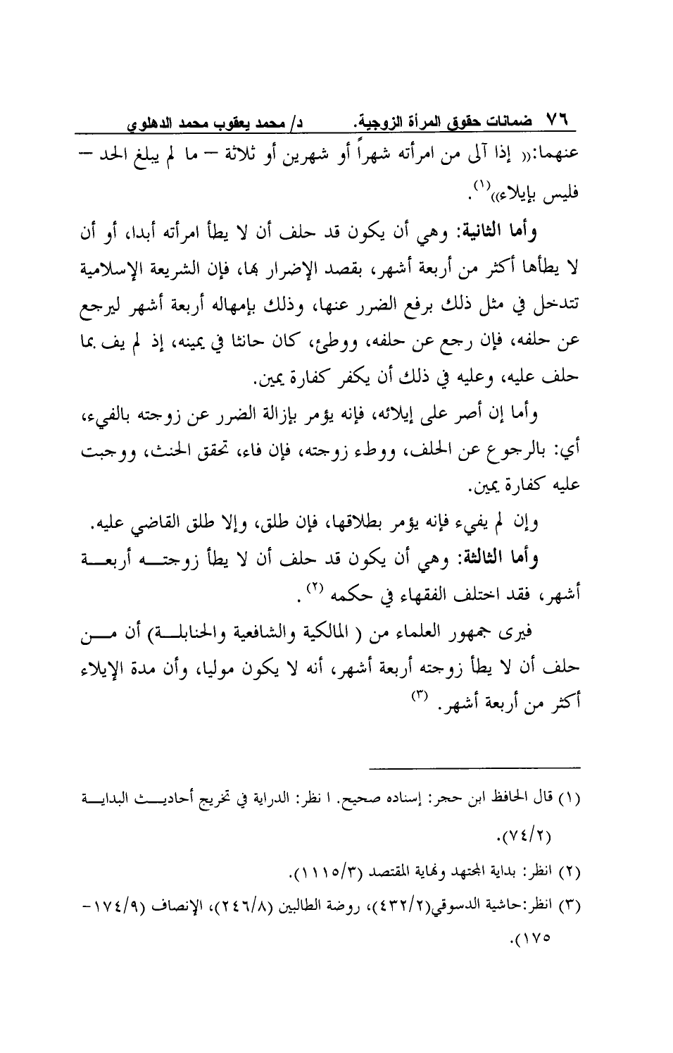 وأما الثانية: وهي أن يكون قد حلف أن لا يطأ امرأته أبدا، أو أن لا يطأها أكثر من أربعة أشهر، بقصد الإضرار بها، فإن الشريعة الإسلامية تتدخل في مثل ذلك برفع الضرر عنها، وذلك بإمهاله أربعة أشهر ليرجع عن حلفه، فإن رجع عن حلفه، ووطئ، كان حانثا في يمينه، إذ لم يف بما حلف عليه، وعليه في ذلك أن يكفر كفارة يمين.