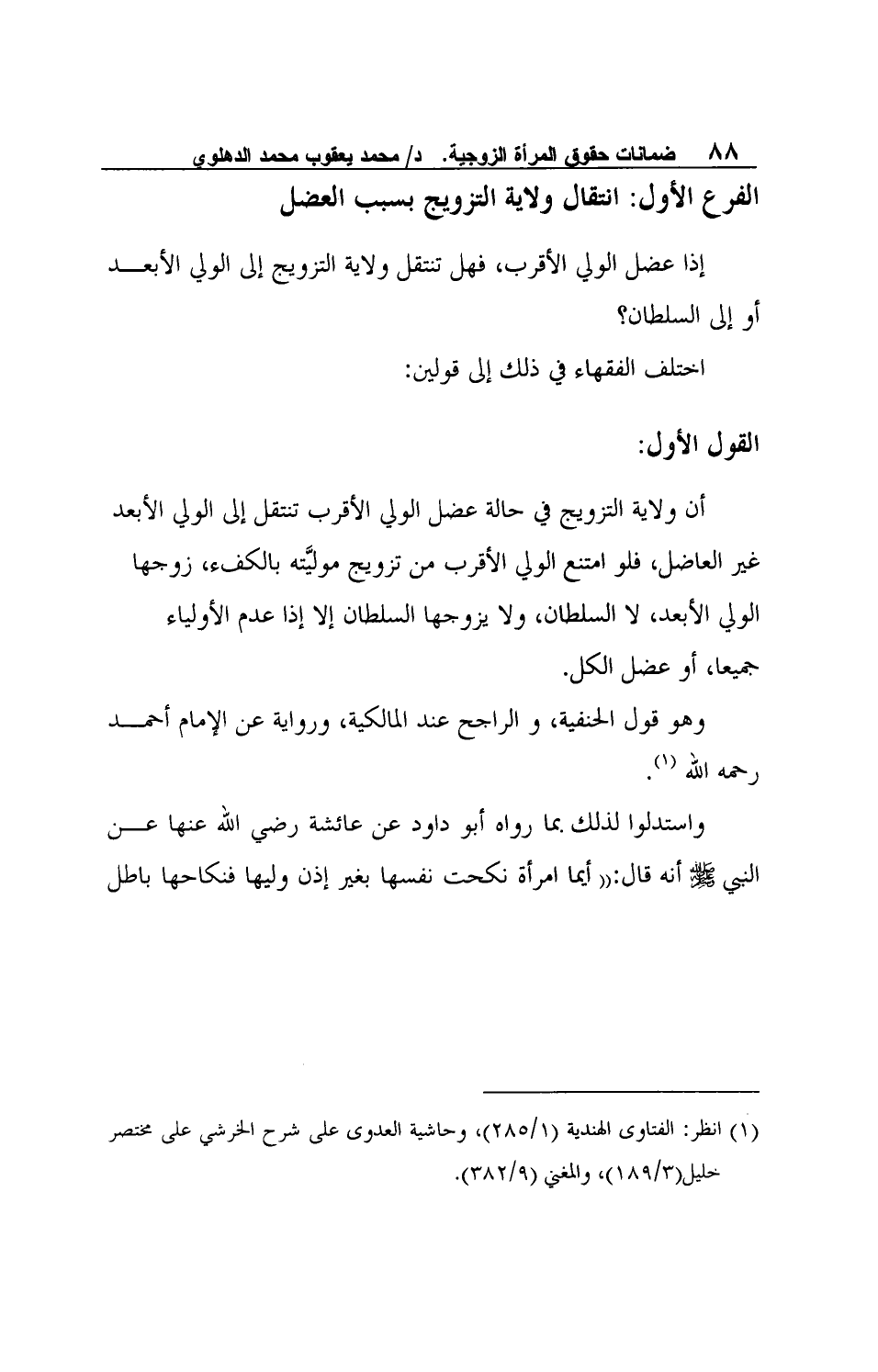 أن ولاية التزويج في حالة عضل الولي الأقرب تنتقل إلى الولي الأبعد غير العاضل، فلو امتنع الولي الأقرب من تزويج موليَّته بالكفء، زوجها الولي الأبعد، لا السلطان، ولا يزوجها السلطان إلا إذا عدم الأولياء جميعا، أو عضل الكل.