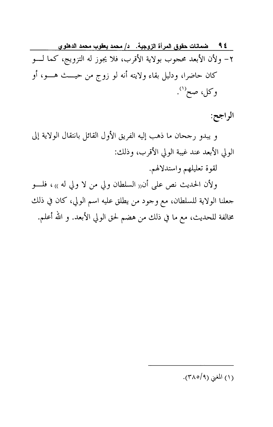 ويبدو رجحان ما ذهب إليه الفريق الأول القائل بانتقال الولاية إلى الولي الأبعد عند غيبة الولي الأقرب، وذلك: