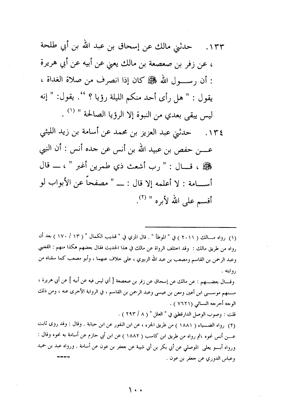 131 - حَدثنِي مَالك عَن إِسْحَاق بن عبد الله بن أبي طَلْحَة عَن زفر بن صعصعة ابْن مَالك عَن أَبِيه عَن أبي هُرَيْرَة أَن رَسُول الله صلى الله عَلَيْهِ وَسلم كَانَ إِذا انْصَرف من صَلَاة الْغَدَاة يَقُول هَل رأى أحد مِنْكُم اللَّيْلَة رُؤْيا