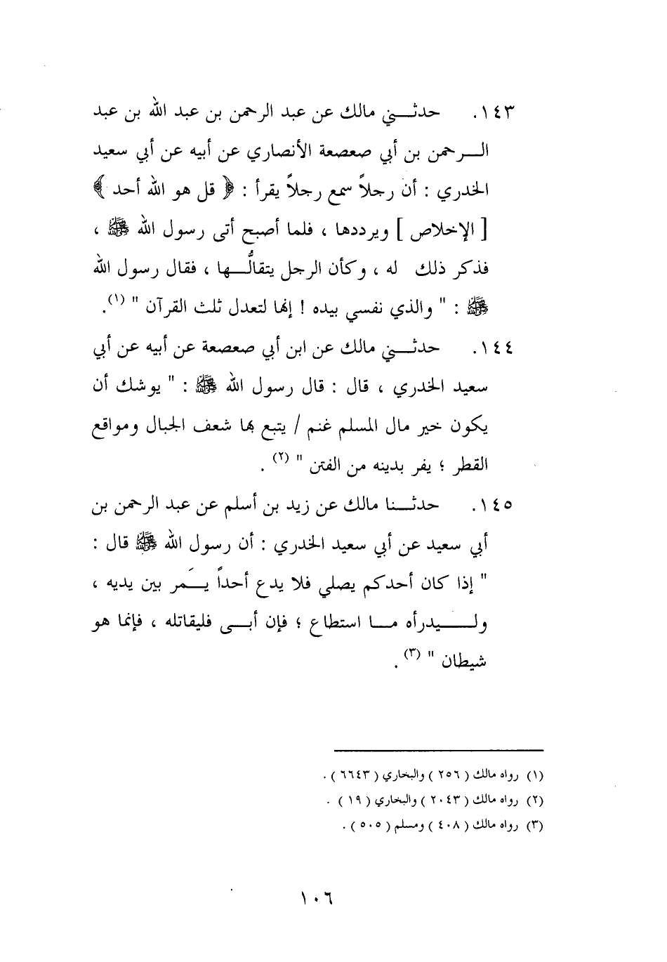 141 - حَدثنِي مَالك عَن عبد الرَّحْمَن بن عبد الله بن عبد الرَّحْمَن بن أبي صعصعة الْأنْصَارِيّ عَن أَبِيه عَن أبي سعيد الْخُدْرِيّ أَن رجلا سمع رجلا يقرأقل هُوَ الله أحد الْإِخْلَاص ويرددها فَلَمَّا أصبح أَتَى رَسُول الله صلى الله عَلَيْهِ وَسلم فَذكر ذَلِك لَهُ وَكَأن الرجل يتقالها فَقَالَ رَسُول الله صلى الله عَلَيْهِ وَسلم وَالَّذِي نَفسِي بِيَدِهِ إِنَّهَا لتعدل ثلث الْقُرْآن