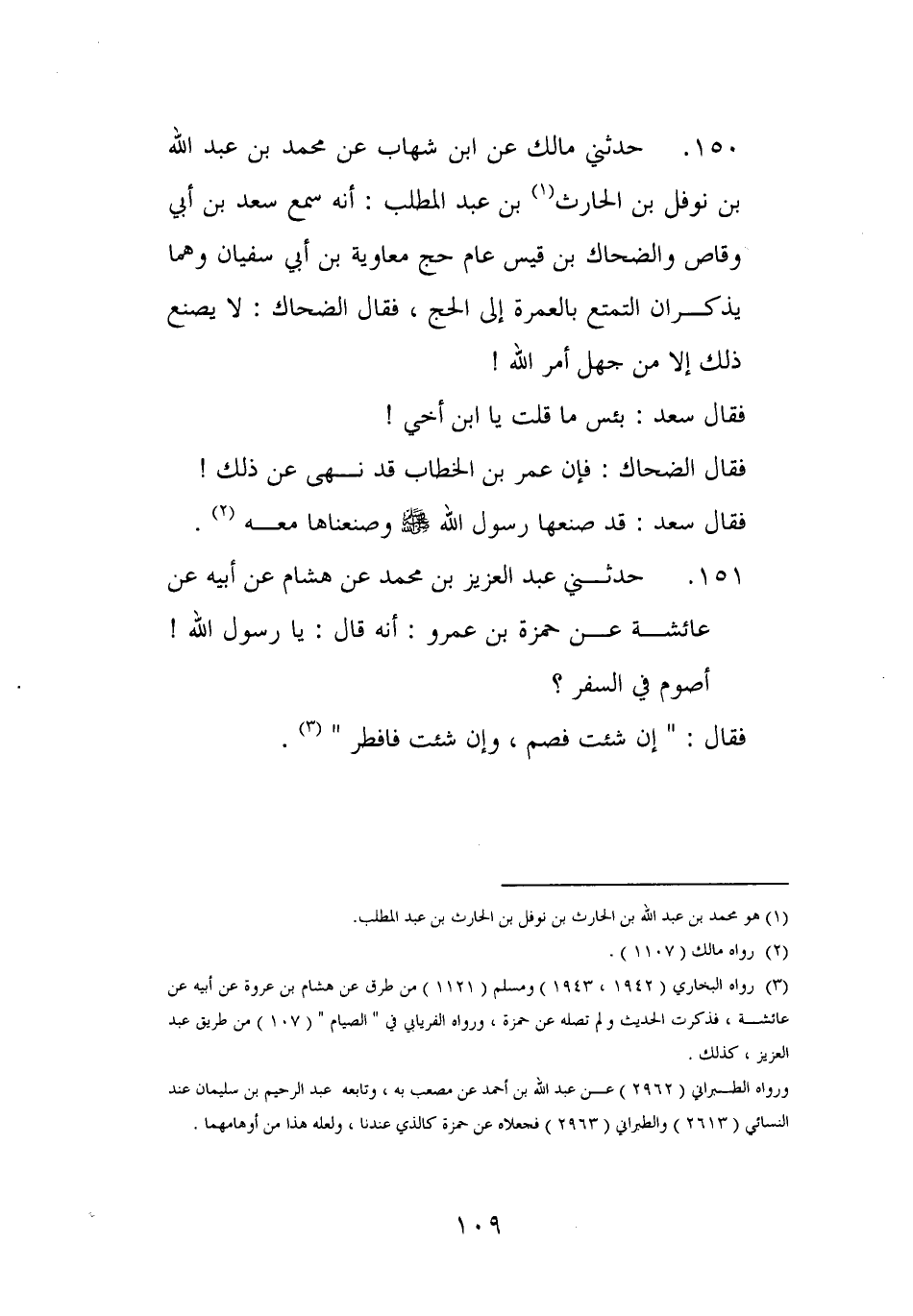 148 - حَدثنِي مَالك عَن ابْن شهَاب عَن مُحَمَّد بن عبد الله بن نَوْفَل بن الْحَارِث ابْن عبد الْمطلب أَنه سمع سعد بن أبي وَقاص وَالضَّحَّاك بن قيس عَام حج مُعَاوِيَة ابْن أبي سُفْيَان وهما يذكران التَّمَتُّع بِالْعُمْرَةِ إِلَى الْحَج فَقَالَ الضَّحَّاك لَا يصنع ذَلِك إِلَّا من جهل أَمر الله فَقَالَ سعد بئس مَا قلت يَا ابْن أخي فَقَالَ الضَّحَّاك فَإِن عمر بن الْخطاب قد نهى عَن ذَلِك فَقَالَ سعد قد صنعها رَسُول الله صلى الله عَلَيْهِ وَسلم وصنعناها مَعَه