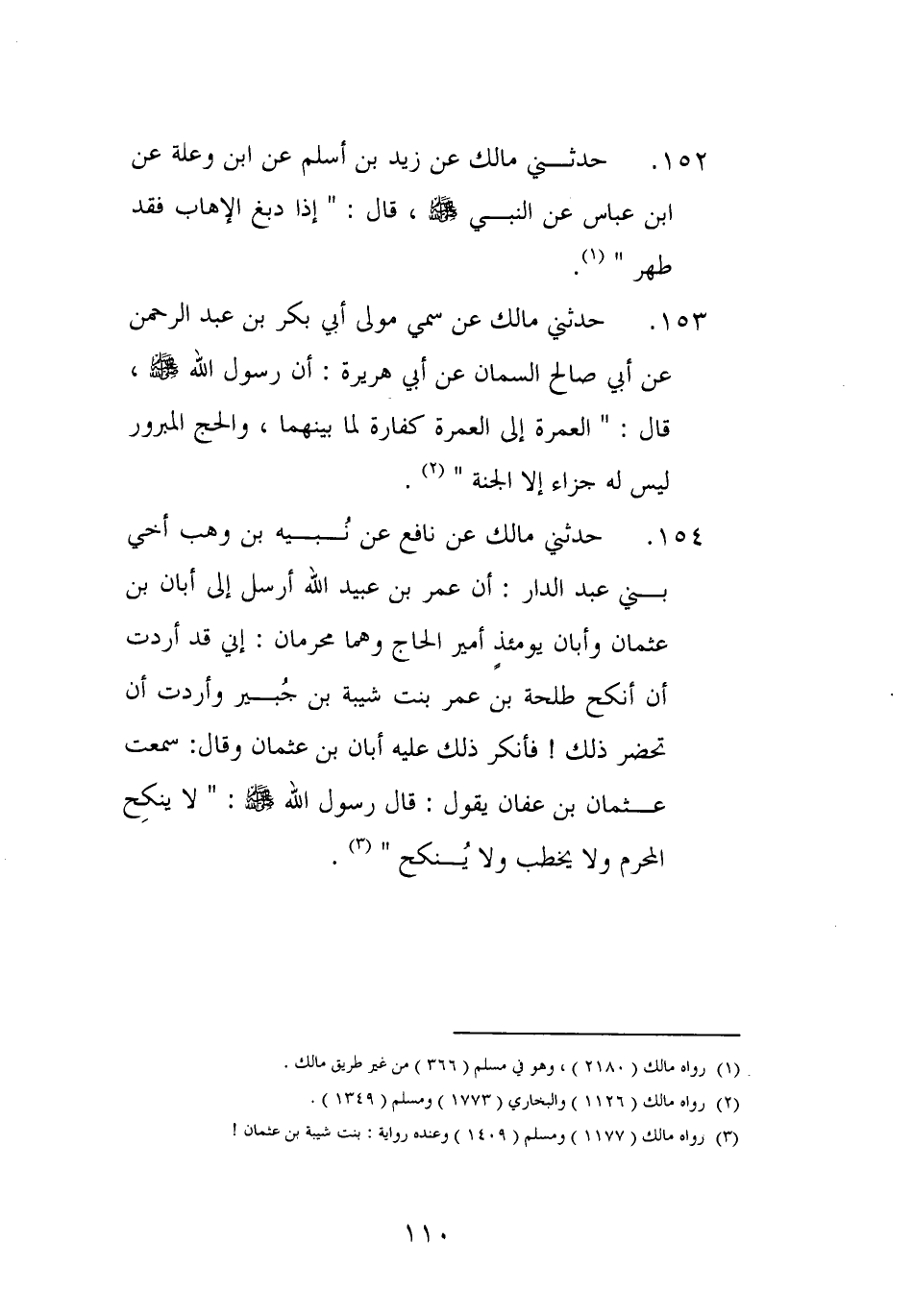 152 - حَدثنِي مَالك عَن نَافِع عَن نبيه بن وهب أخي بني عبد الدَّار أَن عمر بن عبيد الله أرسل إِلَى أبان بن عُثْمَان وَأَبَان يَوْمئِذٍ أَمِير الْحَاج إِنِّي أردْت أَن أنكح طَلْحَة بن عمر بنت شيبَة بن جُبَير وَأَرَدْت أَن تحضر ذَلِك فَأنْكر ذَلِك عَلَيْهِ أبان ابْن عُثْمَان وَقَالَ سَمِعت عُثْمَان بن عَفَّان يَقُول قَالَ رَسُول الله صلى الله عَلَيْهِ وَسلم لَا ينْكح الْمحرم وَلَا يخْطب وَلَا ينْكح