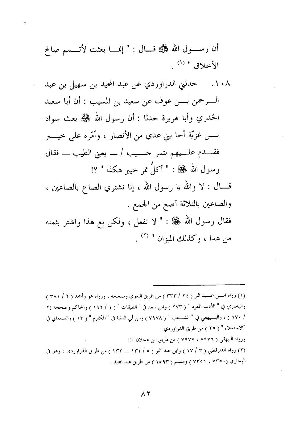 106 - حَدثنِي الدَّرَاورْدِي عَن عبد الْمجِيد بن سُهَيْل بن عبد الرَّحْمَن بن عَوْف عَن سعيد بن الْمسيب أَن أَبَا سعيد الْخُدْرِيّ وَأَبا هُرَيْرَة حَدثا أَن رَسُول الله صلى الله عَلَيْهِ وَسلم بعث سَواد بن غزيَّة أَخا بني عدي من الْأَنْصَار وَأمره على خَيْبَر فَقدم عَلَيْهِ بِتَمْر جنيب يَعْنِي الطّيب فَقَالَ رَسُول الله صلى الله عَلَيْهِ وَسلم أكل تمر خَيْبَر هَكَذَا قَالَ لَا وَالله يَا رَسُول الله إِنَّا نشتري الصَّاع بالصاعين والصاعين بِالثَّلَاثَةِ آصَع من الْجمع