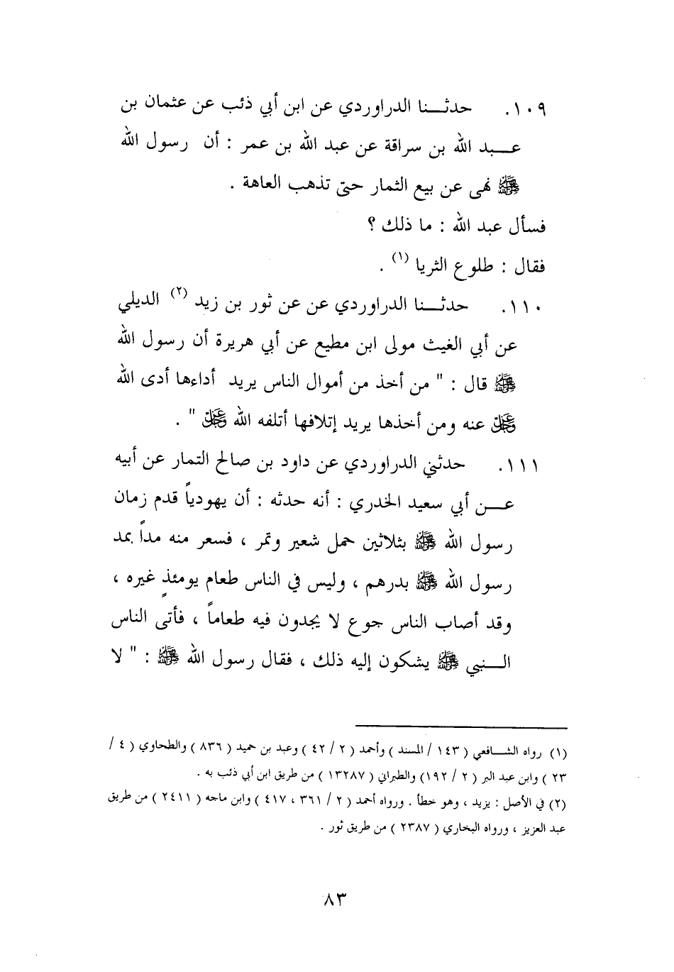 107 - حَدثنَا الدَّرَاورْدِي عَن ابْن أبي ذِئْب عَن عُثْمَان بن عبد الله بن سراقَة عَن عبد الله ابْن عمر أَن رَسُول الله صلى الله عَلَيْهِ وَسلم نهى عَن بيع الثِّمَار حَتَّى تذْهب العاهة