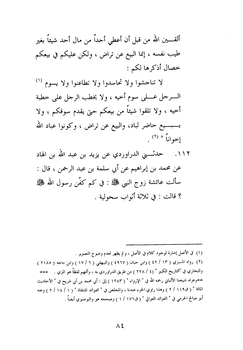 ألقين الله من قبل أَن أعطي أحدا من مَال أحد شَيْئا بِغَيْر طيب نَفسه إِنَّمَا البيع عَن ترَاض وَلَكِن فِي بيعكم خِصَال أذكرها لكم لَا تناجشوا وَلَا تَحَاسَدُوا وَلَا تطاعنوا وَلَا يسوم الرجل على سوم أَخِيه وَلَا يخْطب الرجل على خطْبَة أَخِيه وَلَا تلقوا شَيْئا من بيعكم حَتَّى يقدم سوقكم وَلَا يَبِيع حَاضر لباد وَالْبيع عَن ترَاض وَكُونُوا عباد الله إخْوَانًا