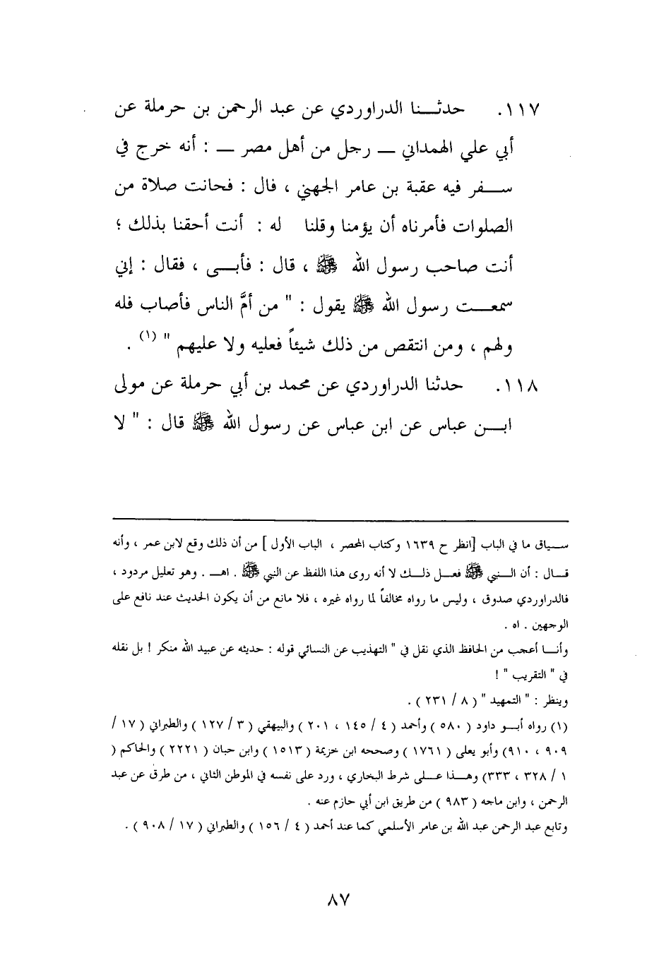 115 - حَدثنَا الدَّرَاورْدِي عَن عبد الرَّحْمَن بن حَرْمَلَة عَن أبي على الْهَمدَانِي رجل من أهل مصر أَنه خرج فِي سفر فِيهِ عقبَة بن عَامر الْجُهَنِيّ فال فحانت صَلَاة من الصَّلَوَات فأمرناه أَن يؤمنا وَقُلْنَا لَهُ أَنْت أحقنا بذلك أَنْت صَاحب رَسُول الله صلى الله عَلَيْهِ وَسلم فَأبى فَقَالَ إِنِّي سَمِعت رَسُول الله صلى الله عَلَيْهِ وَسلم يَقُول من أم النَّاس فَأصَاب فَلهُ وَلَهُم وَمن انْتقصَ من ذَلِك شَيْئا فَعَلَيهِ وَلَا عَلَيْهِم