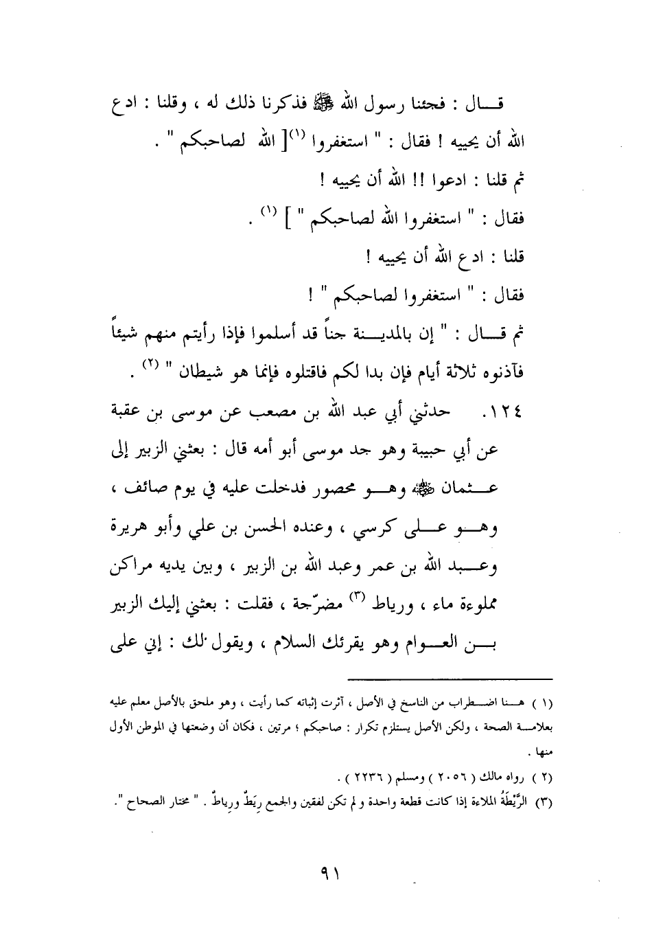 122 - حَدثنِي أبي عبد الله بن مُصعب عَن مُوسَى بن عقبَة عَن أبي حَبِيبَة وَهُوَ جد مُوسَى أَبُو أمه قَالَ بَعَثَنِي الزبير إِلَى عُثْمَان رَضِي الله عَنهُ وَهُوَ مَحْصُور فَدخلت عَلَيْهِ فِي يَوْم صَائِف وَهُوَ على كرْسِي وَعِنْده الْحسن بن عَليّ وَأَبُو هُرَيْرَة وَعبد الله بن عمر وَعبد الله بن الزبير وَبَين يَدَيْهِ مراكن مَمْلُوءَة مَاء ورياط مضرجة فَقلت بَعَثَنِي إِلَيْك الزبير بن الْعَوام وَهُوَ يُقْرِئك السَّلَام وَيَقُول لَك إِنِّي على