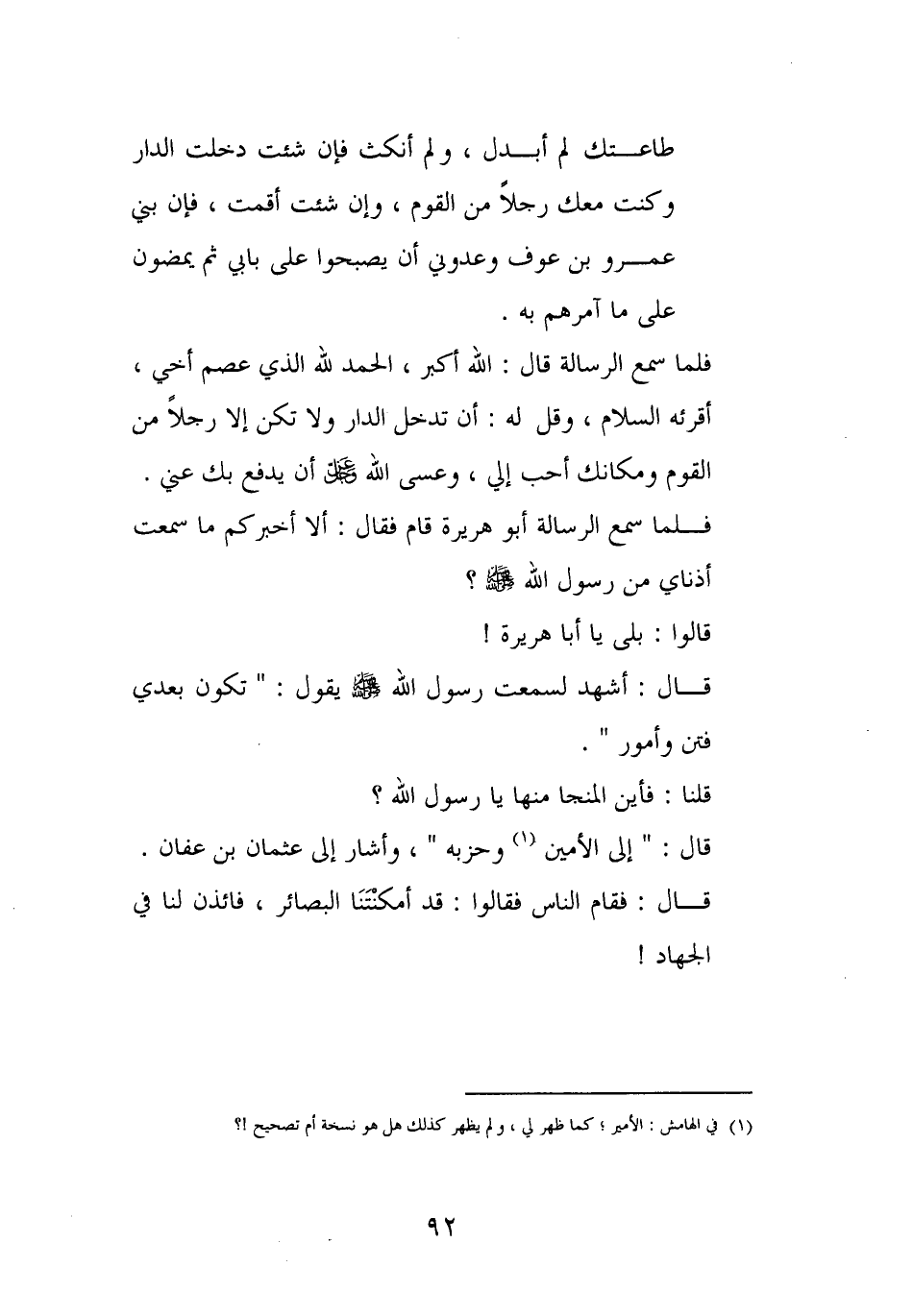 فَلَمَّا سمع الرسَالَة أَبُو هُرَيْرَة قَامَ فَقَالَ أَلا أخْبركُم بِمَا سَمِعت أذناي من رَسُول الله صلى الله عَلَيْهِ وَسلم قَالُوا بلَى يَا أَبَا هُرَيْرَة قَالَ أشهد لسمعت رَسُول الله صلى الله عَلَيْهِ وَسلم يَقُول تكون بعدِي فتن وَأُمُور