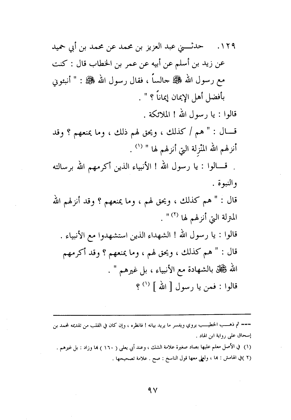 127 - حَدثنِي عبد الْعَزِيز بن مُحَمَّد عَن مُحَمَّد بن أبي حميد عَن زيد بن أسلم عَن أَبِيه عَن عمر بن الْخطاب قَالَ كنت مَعَ رَسُول الله صلى الله عَلَيْهِ وَسلم جَالِسا فَقَالَ رَسُول الله صلى الله عَلَيْهِ وَسلم أنبئوني بِأَفْضَل أهل الْإِيمَان إِيمَانًا