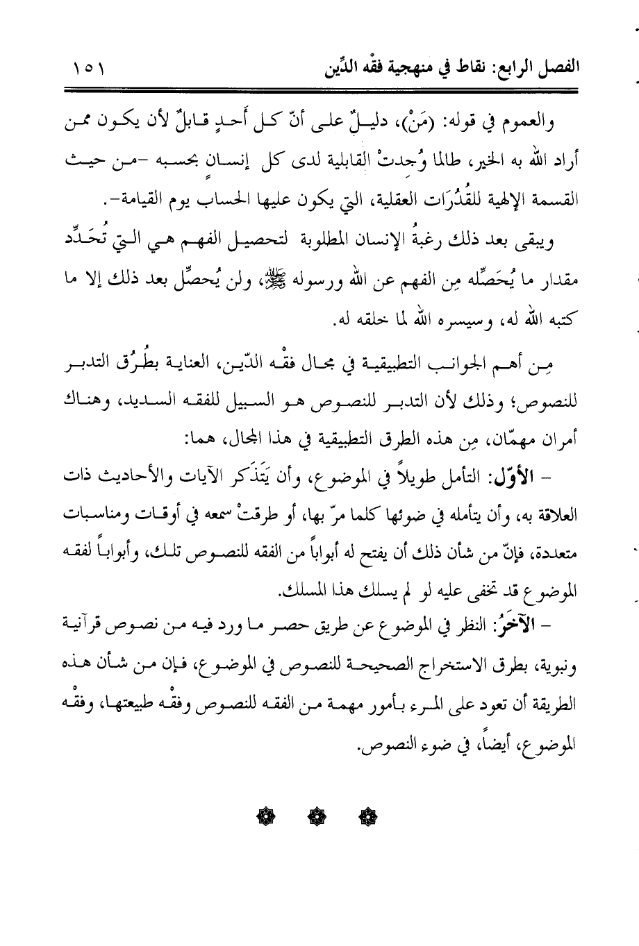 مِن أهم الجوانب التطبيقية في مجال فقْه الدّين، العناية بطُرُق التدبر للنصوص؛ وذلك لأن التدبر للنصوص هو السبيل للفقه السديد، وهناك أمران مهمّان، مِن هذه الطرق التطبيقية في هذا المجال، هما: