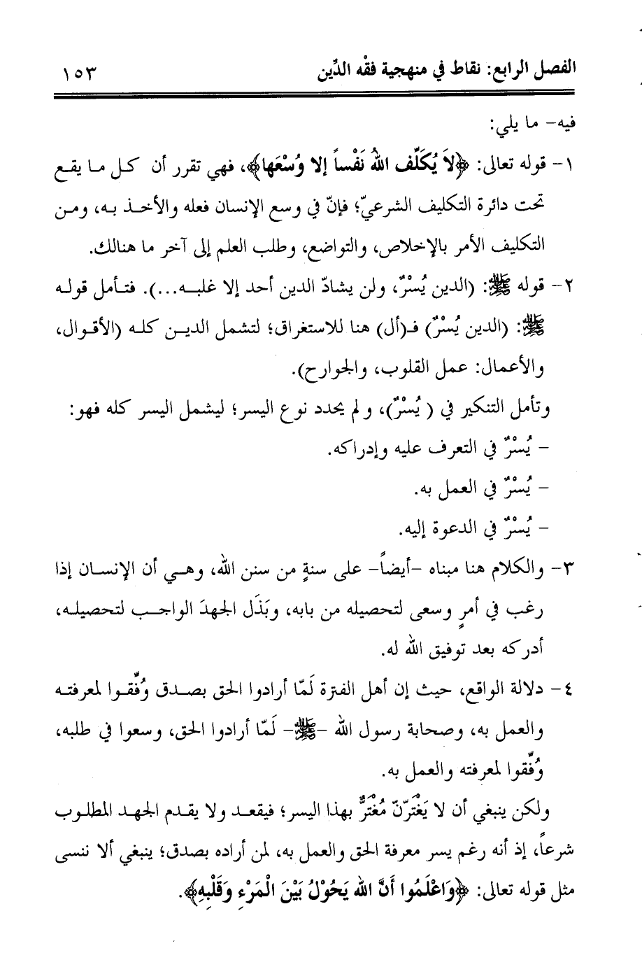 1- قوله تعالى: {لاَ يُكَلِّف اللهُ نَفْساً إلا وُسْعَها} ، فهي تقرر أن كل ما يقع تحت دائرة التكليف الشرعيّ؛ فإنّ في وسع الإنسان فعله والأخذ به، ومن التكليف الأمر بالإخلاص، والتواضع، وطلب العلم إلى آخر ما هنالك.