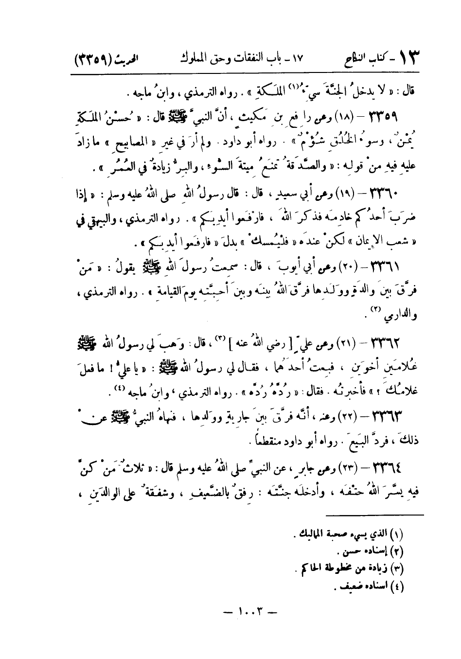 وَعَنْ جَابِرٌ عَنِ النَّبِيِّ صَلَّى اللَّهُ عَلَيْهِ وَسَلَّمَ قَالَ: " ثَلَاثٌ مَنْ كُنَّ فِيهِ يَسَّرَ اللَّهُ حَتْفَهُ وَأَدْخَلَهُ جَنَّتَهُ: رِفْقٌ بِالضَّعِيفِ وَشَفَقَةٌ عَلَى الْوَالِدَيْنِ -[1004]- وَإِحْسَانٌ إِلَى الْمَمْلُوكِ ". رَوَاهُ التِّرْمِذِيُّ وَقَالَ: هَذَا حَدِيثٌ غَرِيبٌ