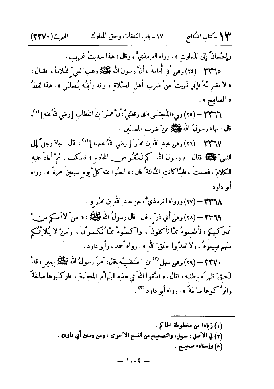 وَعَنْ عَبْدِ اللَّهِ بْنِ عُمَرَ رَضِيَ اللَّهُ عَنْهُمَا قَالَ: جَاءَ رَجُلٌ إِلَى النَّبِيِّ صَلَّى اللَّهُ عَلَيْهِ وَسَلَّمَ فَقَالَ: يَا رَسُولَ اللَّهِ كم نَعْفُو عَنِ الْخَادِمِ؟ فَسَكَتَ ثُمَّ أَعَادَ عَلَيْهِ الْكَلَامَ فصمتَ فلمَّا كانتِ الثَّالثةُ قَالَ: «اعفُوا عَنْهُ كُلَّ يَوْمٍ سَبْعِينَ مَرَّةً» . رَوَاهُ أَبُو دَاوُد