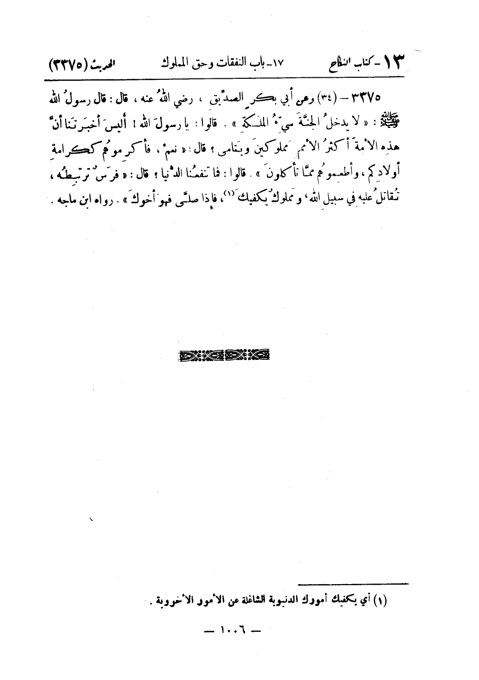 وَعَنْ أَبِي بَكْرٍ الصِّدِّيقِ رَضِيَ اللَّهُ عَنْهُ قَالَ: قَالَ رَسُولُ اللَّهِ صَلَّى اللَّهُ عَلَيْهِ وَسَلَّمَ: «لَا يَدْخُلُ الْجَنَّةَ سَيِّئُ الْمَلَكَةِ» . قَالُوا: يَا رَسُولَ اللَّهِ أَلَيْسَ أَخْبَرْتَنَا أَنَّ هَذِهِ الْأُمَّةَ أَكْثَرُ الْأُمَمِ مَمْلُوكِينَ وَيَتَامَى؟ قَالَ: «نَعَمْ فَأَكْرِمُوهُمْ كَكَرَامَةِ أَوْلَادِكُمْ وَأَطْعِمُوهُمْ مِمَّا تَأْكُلُونَ» . قَالُوا: فَمَا تنفعنا الدُّنْيَا؟ قَالَ: «فَرَسٌ تَرْتَبِطُهُ تُقَاتِلُ عَلَيْهِ فِي سَبِيلِ اللَّهِ وَمَمْلُوكٌ يَكْفِيكَ فَإِذَا صَلَّى فَهُوَ أَخُوكَ» . رَوَاهُ ابْنُ مَاجَهْ