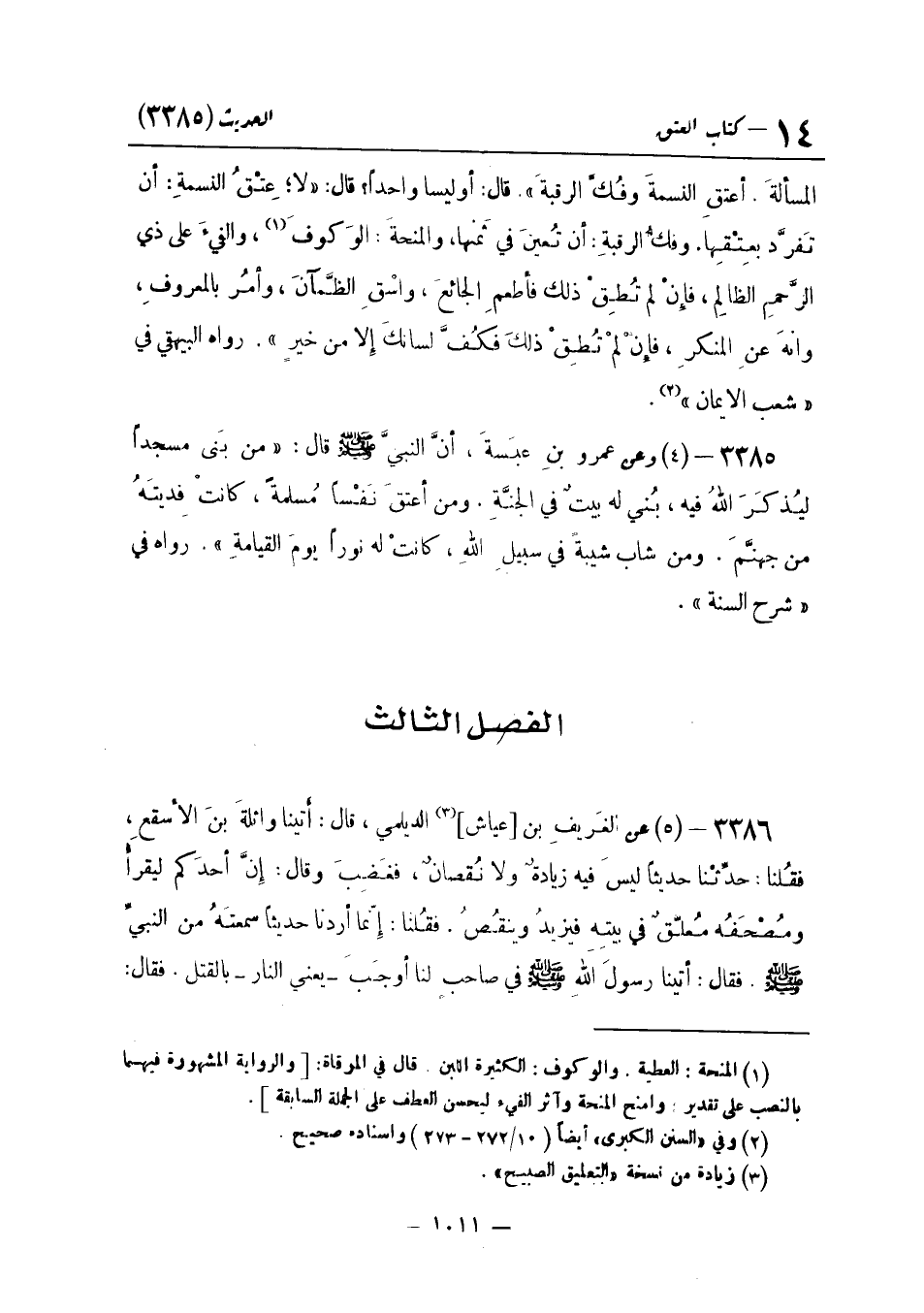 وَعَن عَمْرو بن عبسة أَنَّ النَّبِيَّ صَلَّى اللَّهُ عَلَيْهِ وَسَلَّمَ قَالَ: «مَنْ بَنَى مَسْجِدًا لِيُذْكَرَ اللَّهُ فِيهِ بُنِيَ لَهُ بَيْتٌ فِي الْجَنَّةِ وَمَنْ أَعْتَقَ نَفْسًا مُسْلِمَةً كَانَتْ فِدْيَتَهُ مِنْ جَهَنَّمَ. وَمَنْ شَابَ شَيْبَةً فِي سَبِيلِ اللَّهِ كَانَتْ لَهُ نُورًا يَوْم الْقِيَامَة» . رَوَاهُ فِي شرح السّنة
