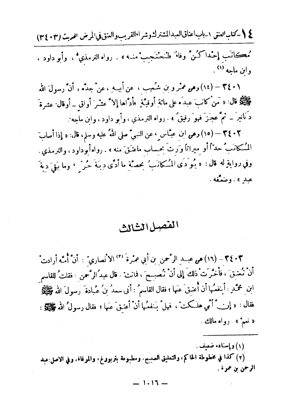 وَعَنِ ابْنِ عَبَّاسٍ عَنِ النَّبِيِّ صَلَّى اللَّهُ عَلَيْهِ وَسَلَّمَ قَالَ: «إِذَا أَصَابَ الْمُكَاتَبُ حَدًّا أَوْ مِيرَاثًا وَرِثَ بِحِسَابِ مَا عَتَقَ مِنْهُ» . رَوَاهُ أَبُو دَاوُدَ وَالتِّرْمِذِيُّ وَفِي رِوَايَةٍ لَهُ قَالَ: «يُودَى الْمُكَاتَبُ بِحِصَّةِ مَا أَدَّى دِيَةَ حر وَمَا بَقِي دِيَة عبد» . وَضَعفه