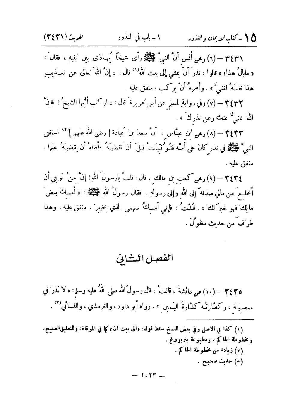 وَعَنْ أَنَسٍ أَنَّ النَّبِيَّ صَلَّى اللَّهُ عَلَيْهِ وَسَلَّمَ رَأَى شَيْخًا يُهَادَى بَيْنَ ابْنَيْهِ فَقَالَ: «مَا بَالُ هَذَا؟» قَالُوا: نَذَرَ أَنْ يَمْشِيَ إِلَى بَيت الله قَالَ: «إِنَّ اللَّهَ تَعَالَى عَنْ تَعْذِيبِ هَذَا نَفسه لَغَنِيّ» . وَأمره أَن يركب