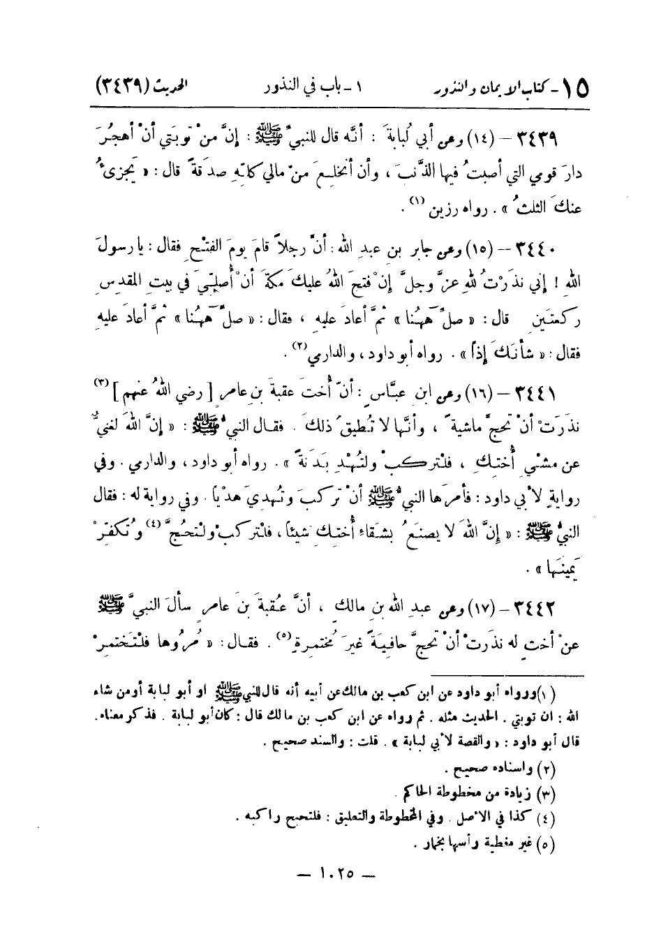 وَعَنْ عَبْدِ اللَّهِ بْنِ مَالِكٍ أَنَّ عُقْبَةَ بن عَامر سَأَلَ النَّبِيَّ صَلَّى اللَّهُ عَلَيْهِ وَسَلَّمَ عَنْ أُخْتٍ لَهُ نَذَرَتْ أَنْ تَحُجَّ حَافِيَةً غَيْرَ مُخْتَمِرَةٍ فَقَالَ: «مُرُوهَا فَلْتَخْتَمِرْ -[1026]- وَلْتَرْكَبْ وَلْتَصُمْ ثَلَاثَةَ أَيَّامٍ» . رَوَاهُ أَبُو دَاوُدَ وَالتِّرْمِذِيُّ وَالنَّسَائِيُّ وَابْنُ مَاجَهْ والدارمي