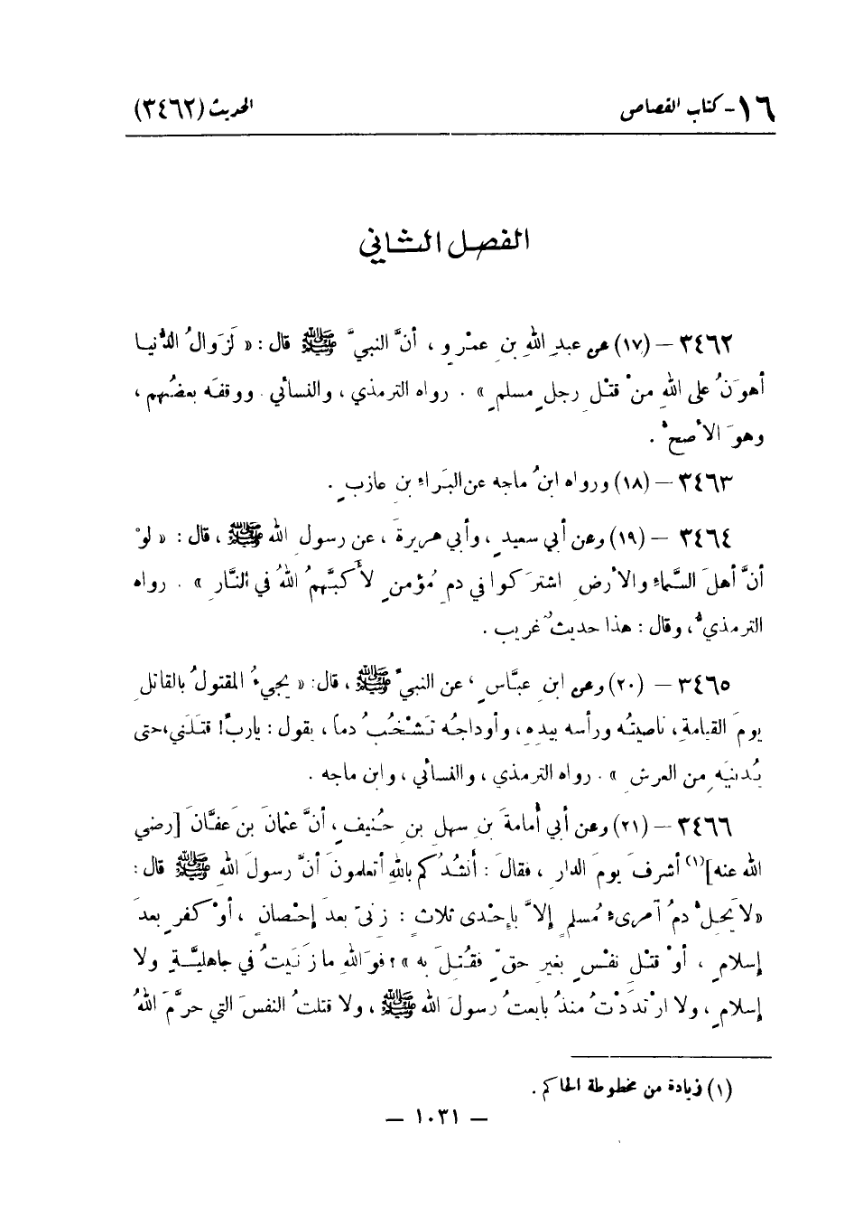 عَنْ عَبْدِ اللَّهِ بْنِ عَمْرٍو أَنَّ النَّبِيَّ صَلَّى اللَّهُ عَلَيْهِ وَسَلَّمَ قَالَ: «لَزَوَالُ الدُّنْيَا أَهْوَنُ عَلَى اللَّهِ مِنْ قَتْلِ رَجُلٍ مُسْلِمٍ» . رَوَاهُ التِّرْمِذِيّ وَالنَّسَائِيّ ووقفَه بعضُهم وَهُوَ الْأَصَح