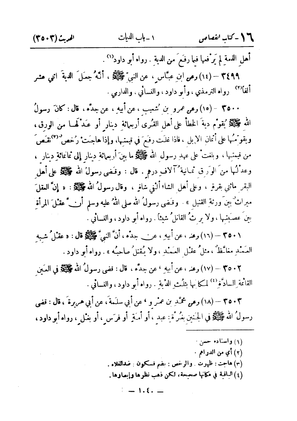وَعَنْ عَمْرِو بْنِ شُعَيْبٍ عَنْ أَبِيهِ عَنْ جَدِّهِ قَالَ: كَانَ رَسُولُ اللَّهِ صَلَّى اللَّهُ عَلَيْهِ وَسَلَّمَ يُقَوِّمُ دِيَةَ الْخَطَأِ عَلَى أَهْلِ الْقُرَى أَرْبَعَمِائَةِ دِينَارٍ أَوْ عِدْلَهَا مِنَ الْوَرِقِ وَيُقَوِّمُهَا عَلَى أَثْمَانِ الْإِبِلِ فَإِذَا غَلَتْ رَفَعَ فِي قيمتِها وإِذا هاجَتْ رُخصٌ نَقَصَ مِنْ قِيمَتِهَا وَبَلَغَتْ عَلَى عَهْدِ رَسُولِ اللَّهِ صَلَّى اللَّهُ عَلَيْهِ وَسَلَّمَ مَا بَيْنَ أَرْبَعِمِائَةِ دِينَارٍ إِلَى ثَمَانِمِائَةِ دِينَارٍ وَعِدْلُهَا مِنَ الْوَرِقِ ثَمَانِيَةُ آلَافِ دِرْهَمٍ قَالَ: وَقَضَى رَسُولِ اللَّهِ صَلَّى اللَّهُ عَلَيْهِ وَسَلَّمَ عَلَى أَهْلِ الْبَقَرِ مِائَتَيْ بَقَرَةٍ وَعَلَى أَهْلِ الشَّاءِ أَلْفَيْ شَاةٍ وَقَالَ رَسُولُ اللَّهِ صَلَّى اللَّهُ عَلَيْهِ وَسَلَّمَ: «إِنَّ الْعَقْلَ مِيرَاثٌ بَيْنَ وَرَثَةِ الْقَتِيلِ» وَقَضَى رَسُولُ اللَّهِ صَلَّى اللَّهُ عَلَيْهِ وَسَلَّمَ أَنَّ عَقْلَ الْمَرْأَةِ بَيْنَ عَصَبَتِهَا وَلَا يَرِثُ القاتلُ شَيْئا. رَوَاهُ أَبُو دَاوُد وَالنَّسَائِيّ