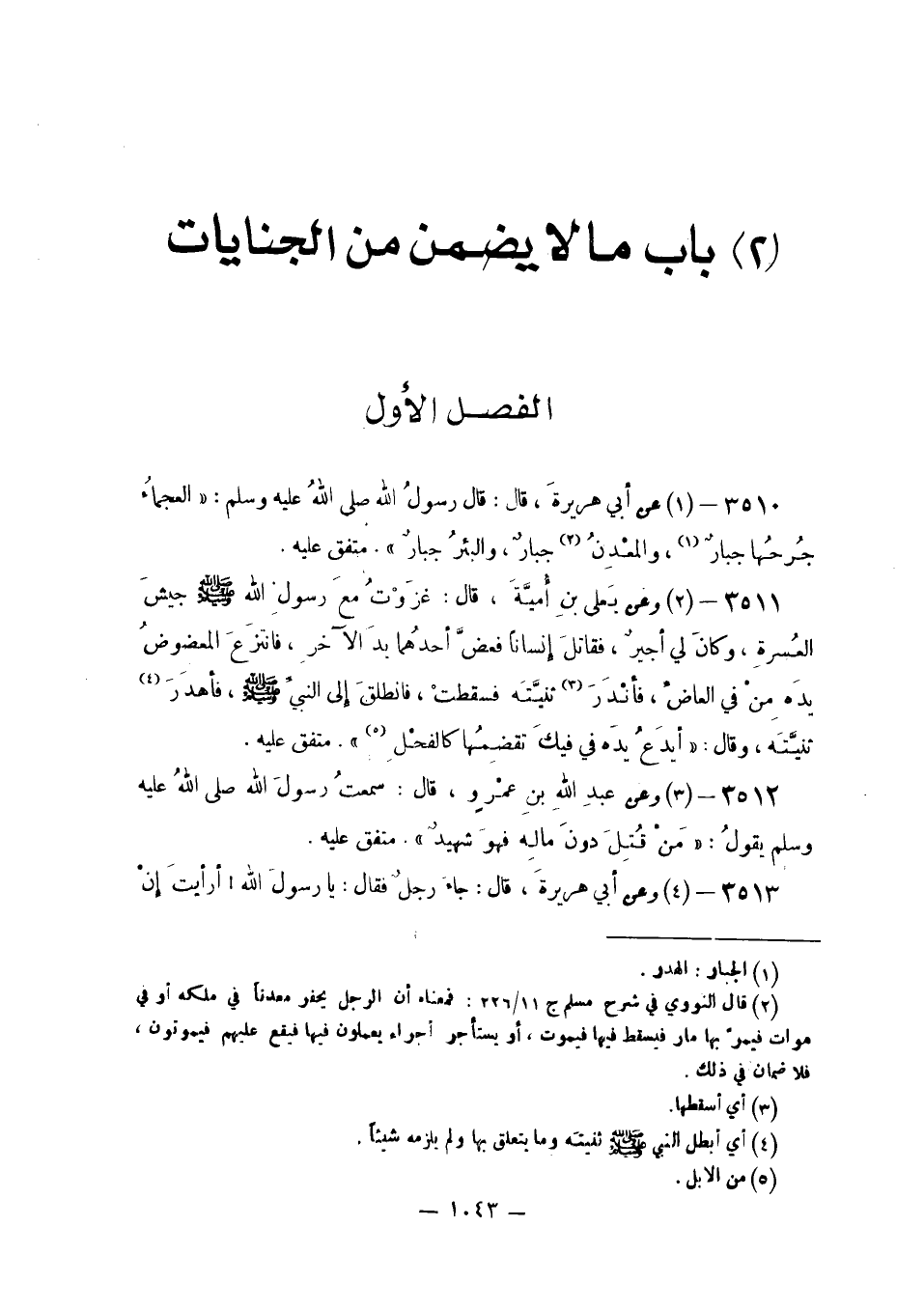 عَنْ أَبِي هُرَيْرَةَ قَالَ: قَالَ رَسُولُ اللَّهِ صَلَّى اللَّهُ عَلَيْهِ وَسَلَّمَ: «الْعَجْمَاءُ جَرْحُهَا جُبَارٌ وَالْمَعْدِنُ جُبَارٌ وَالْبِئْرُ جُبَارٌ»