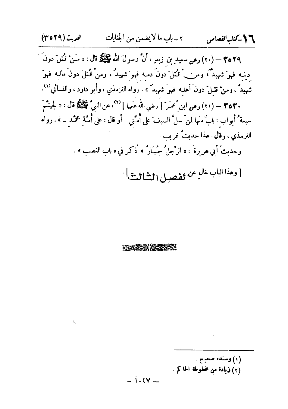 وَعَن سعيدِ بنِ زيدٍ أَنَّ رَسُولَ اللَّهِ صَلَّى اللَّهُ عَلَيْهِ وَسَلَّمَ قَالَ: «مَنْ قُتِلَ دُونَ دِينِهِ فَهُوَ شَهِيدٌ وَمَنْ قُتِلَ دُونَ دَمِهِ فَهُوَ شَهِيدٌ وَمَنْ قُتِلَ دُونَ مَالِهِ فَهُوَ شَهِيدٌ وَمَنْ قُتِلَ دُونَ أَهْلِهِ فَهُوَ شَهِيدٌ» . رَوَاهُ التِّرْمِذِيُّ وَأَبُو دَاوُدَ وَالنَّسَائِيُّ