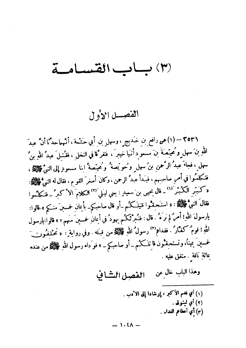 عَنْ رَافِعِ بْنِ خَدِيجٍ وَسَهْلِ بْنِ أَبِي حَثْمة أَنَّهُمَا حَدَّثَا أَنَّ عَبْدَ اللَّهِ بْنَ سَهْلٍ وَمُحَيِّصَةَ بْنَ مَسْعُودٍ أَتَيَا خَيْبَرَ فَتَفَرَّقَا فِي النَّخْلِ فَقُتِلَ عَبْدُ اللَّهِ بْنُ سَهْلٍ فَجَاءَ عَبْدُ الرَّحْمَنِ بْنُ سَهْلٍ وَحُوَيِّصَةُ وَمُحَيِّصَةُ ابْنَا مَسْعُودٍ إِلَى النَّبِيِّ صَلَّى اللَّهُ عَلَيْهِ وَسَلَّمَ فَتَكَلَّمُوا فِي أَمْرِ صَاحِبِهِمْ فَبَدَأَ عَبْدُ الرَّحْمَنِ وَكَانَ أَصْغَر الْقَوْم فَقَالَ لَهُ النَّبِيُّ صَلَّى اللَّهُ عَلَيْهِ وَسَلَّمَ: " كبر الْكبر قَالَ يحيى بن سعد: يَعْنِي لِيَلِيَ الْكَلَامَ الْأَكْبَرُ فَتَكَلَّمُوا فَقَالَ النَّبِيُّ صَلَّى اللَّهُ عَلَيْهِ وَسَلَّمَ: «اسْتَحِقُّوا قَتِيلَكُمْ أَوْ قَالَ صَاحِبَكُمْ بِأَيْمَانِ خَمْسِينَ مِنْكُمْ» . قَالُوا: يَا رَسُولَ اللَّهِ أَمْرٌ لَمْ نَرَهُ قَالَ: فَتُبَرِّئُكُمْ يَهُودُ فِي أَيْمَانِ خَمْسِينَ مِنْهُمْ؟ قَالُوا: يَا رَسُولَ اللَّهِ قَوْمٌ كُفَّارٌ فَفَدَاهُمْ رَسُولُ اللَّهِ صَلَّى اللَّهُ عَلَيْهِ وَسَلَّمَ مِنْ قِبَلِهِ. وَفِي رِوَايَةٍ: «تَحْلِفُونَ خَمْسِينَ يَمِينًا وَتَسْتَحِقُّونَ قَاتِلَكُمْ أَوْ صَاحِبَكُمْ» فَوَدَاهُ رَسُولُ اللَّهِ صَلَّى اللَّهُ عَلَيْهِ وَسَلَّمَ مَنْ عِنْده بِمِائَة نَاقَة
