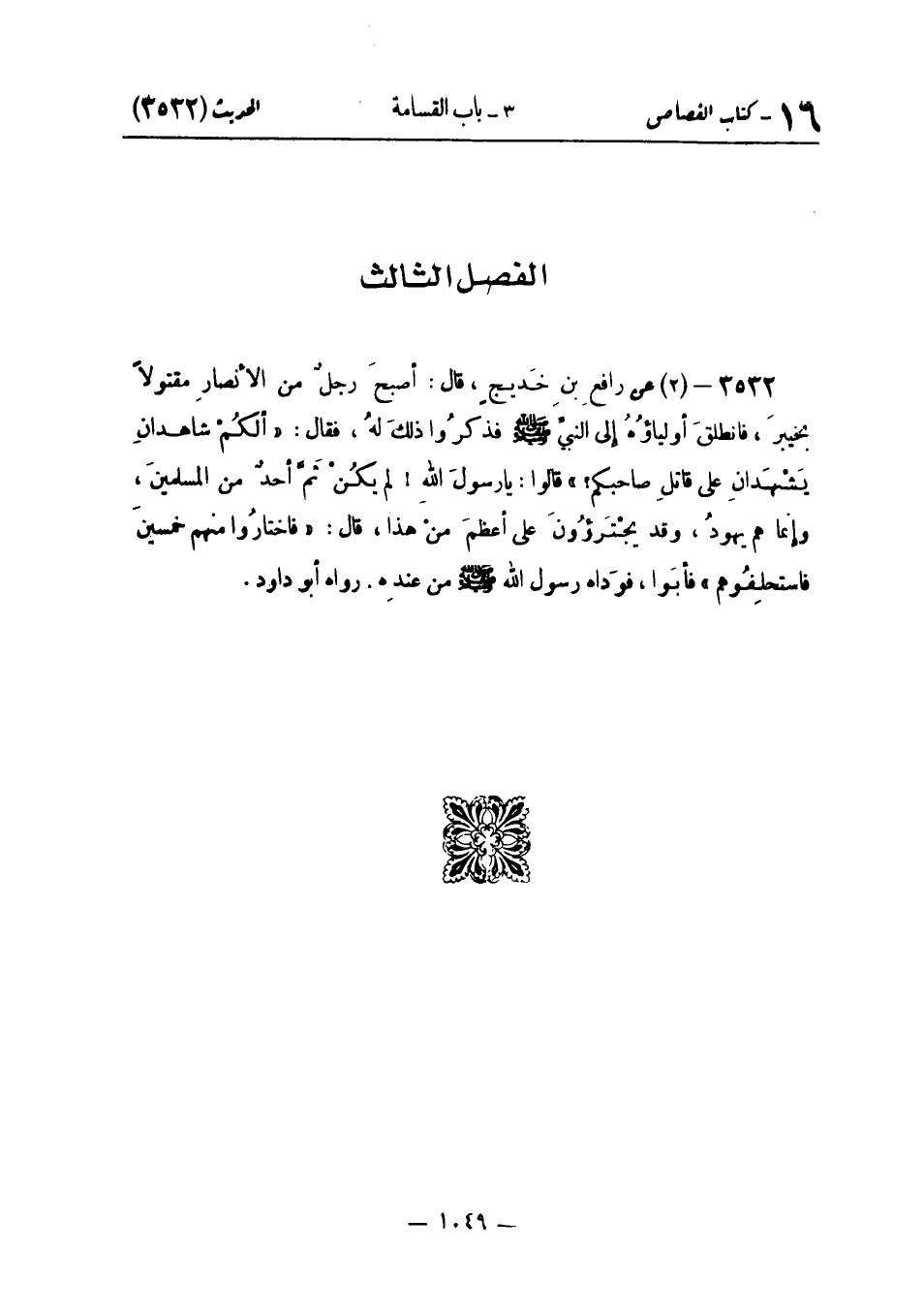 عَنْ رَافِعِ بْنِ خَدِيجٍ قَالَ: أَصْبَحَ رَجُلٌ مِنَ الْأَنْصَارِ مَقْتُولًا بِخَيْبَرَ فَانْطَلَقَ أَوْلِيَاؤُهُ إِلَى النَّبِيِّ صَلَّى اللَّهُ عَلَيْهِ وَسَلَّمَ فَذَكَرُوا ذَلِكَ لَهُ فَقَالَ: «أَلَكُمْ شَاهِدَانِ يَشْهَدَانِ عَلَى قَاتِلِ صَاحِبِكُمْ؟» قَالُوا: يَا رَسُولَ اللَّهِ لَمْ يَكُنْ ثَمَّ أحدٌ من المسلمينَ وإِنما هُوَ يهود وَقد يجترئون عَلَى أَعْظَمَ مِنْ هَذَا قَالَ: «فَاخْتَارُوا مِنْهُمْ خَمْسِينَ فَاسْتَحْلِفُوهُمْ» . فَأَبَوْا فَوَدَاهُ رَسُولُ اللَّهِ صَلَّى اللَّهُ عَلَيْهِ وَسَلَّمَ مِنْ عِنْدِهِ. رَوَاهُ أَبُو دَاوُد
