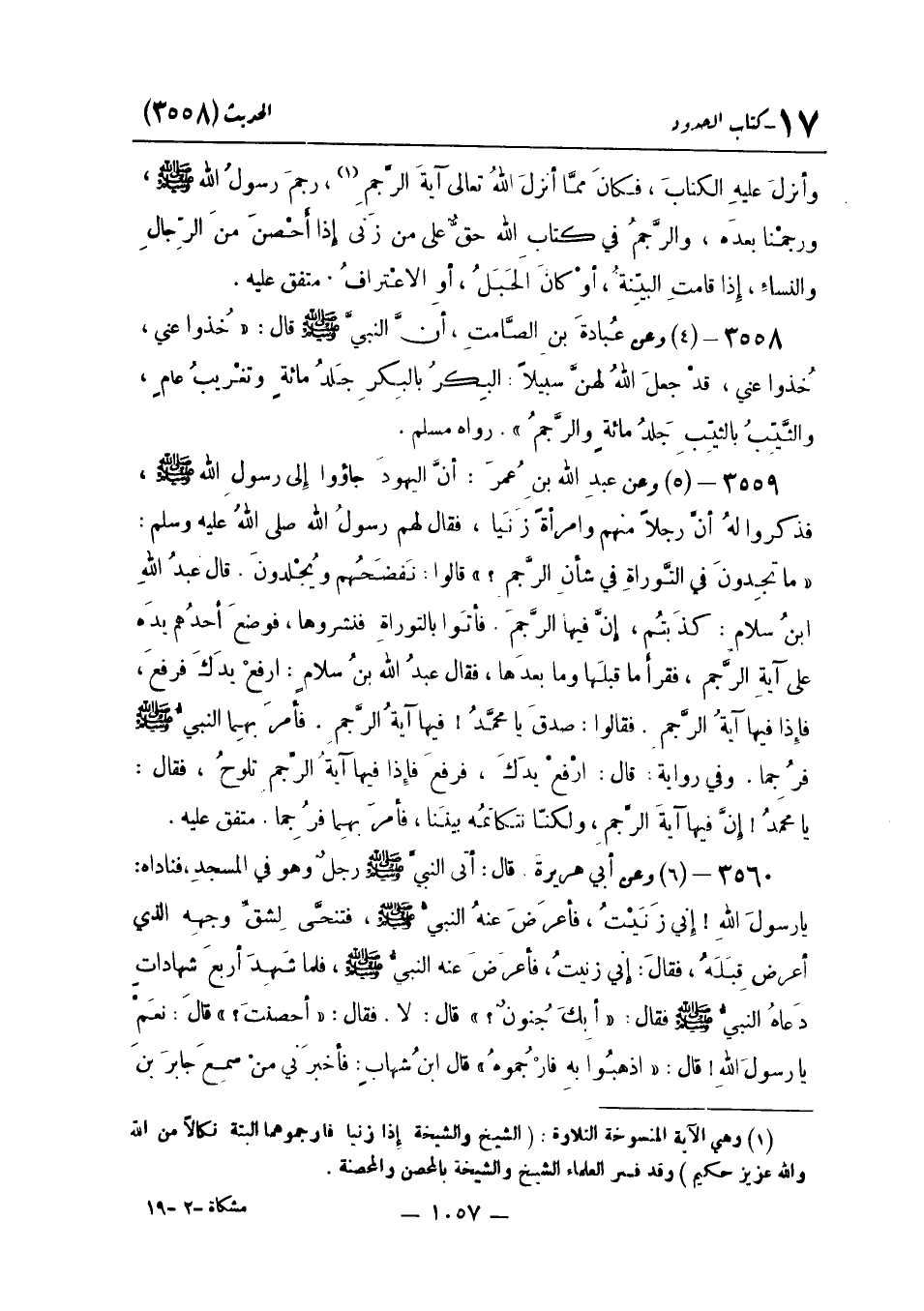وَعَنْ عَبْدِ اللَّهِ بْنِ عُمَرَ: أَن الْيَهُود جاؤوا إِلَى رَسُولِ اللَّهِ صَلَّى اللَّهُ عَلَيْهِ وَسَلَّمَ فَذَكَرُوا لَهُ أَنَّ رَجُلًا مِنْهُمْ وَامْرَأَةً زَنَيَا فَقَالَ لَهُمْ رَسُولُ اللَّهِ صَلَّى اللَّهُ عَلَيْهِ وَسَلَّمَ: «مَا تَجِدُونَ فِي التَّوْرَاةِ فِي شَأْنِ الرَّجْمِ؟» قَالُوا: نَفْضَحُهُمْ وَيُجْلَدُونَ قَالَ عَبْدُ اللَّهِ بْنُ سَلَامٍ: كَذَبْتُمْ إِنَّ فِيهَا الرَّجْمَ فَأْتُوا بِالتَّوْرَاةِ فَنَشَرُوهَا فَوَضَعَ أَحَدُهُمْ يَدَهُ عَلَى آيَةِ الرَّجْمِ فَقَرَأَ مَا قَبْلَهَا وَمَا بَعْدَهَا فَقَالَ عَبْدُ اللَّهِ بْنُ سَلَامٍ: ارْفَعْ يَدَكَ فَرَفَعَ فإِذا فِيهَا آيةُ الرَّجم. فَقَالُوا: صدقَ يَا محمَّدُ فِيهَا آيَة الرَّجْم. فَأمر بهما النَّبِي صلى اللَّهُ عَلَيْهِ وَسَلَّمَ فَرُجِمَا. وَفِي رِوَايَةٍ: قَالَ: ارْفَعْ يَدَكَ فَرَفَعَ فَإِذَا فِيهَا آيَةُ الرَّجْمِ تَلُوحُ فَقَالَ: يَا مُحَمَّدُ إِنَّ فِيهَا آيَةَ الرَّجْمِ وَلِكِنَّا نَتَكَاتَمُهُ بَيْنَنَا فَأَمَرَ بِهِمَا فَرُجِمَا