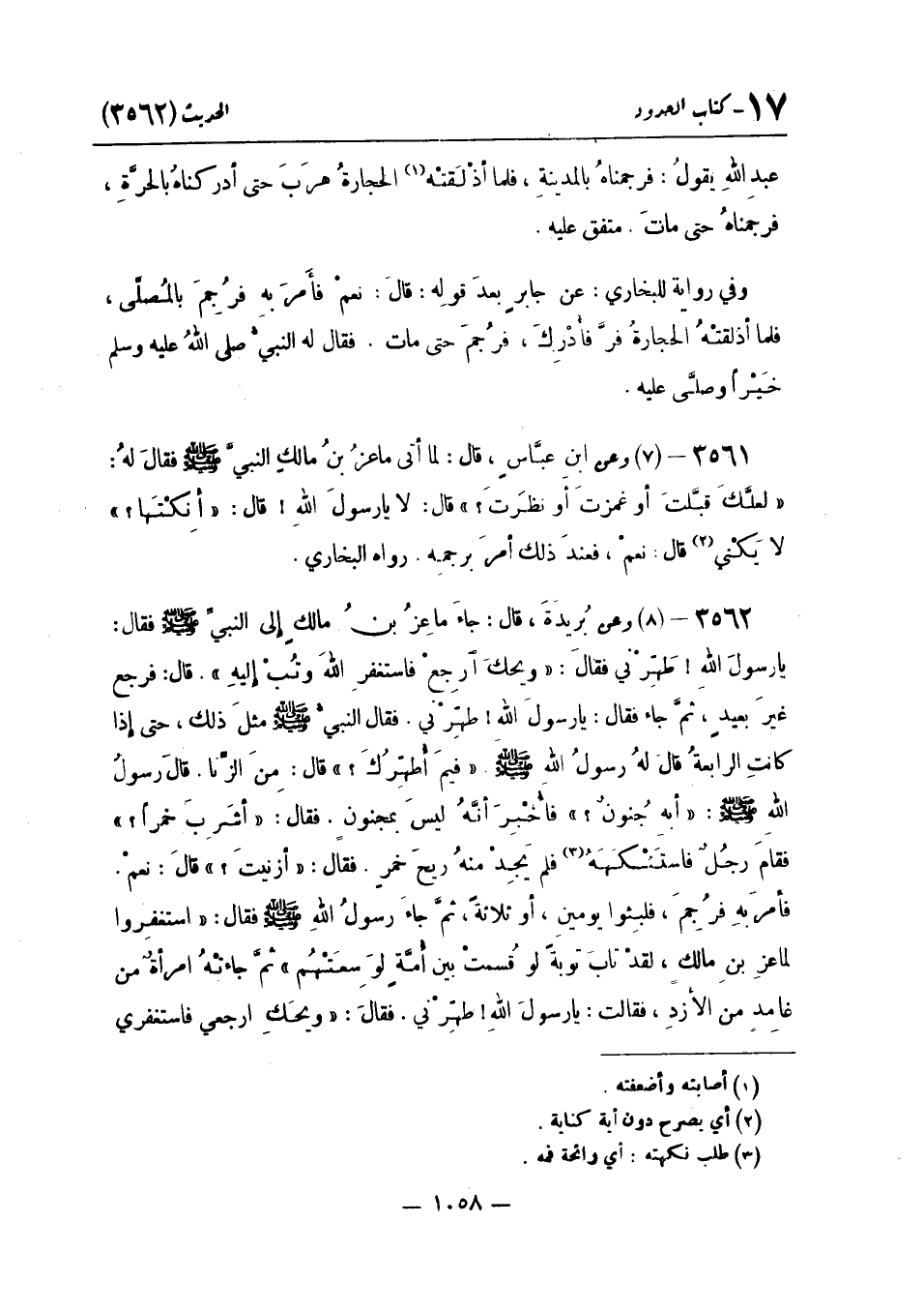 وَعَنِ ابْنِ عَبَّاسٍ قَالَ: لَمَّا أَتَى مَاعِزُ بن مَالك النَّبِيِّ صَلَّى اللَّهُ عَلَيْهِ وَسَلَّمَ فَقَالَ لَهُ: «لَعَلَّكَ قَبَّلْتَ أَوْ غَمَزْتَ أَوْ نَظَرْتَ؟» قَالَ: لَا يَا رَسُولَ اللَّهِ قَالَ: «أَنِكْتَهَا؟» لَا يُكَنِّي قَالَ: نَعَمْ فَعِنْدَ ذَلِكَ أَمر رجمه. رَوَاهُ البُخَارِيّ